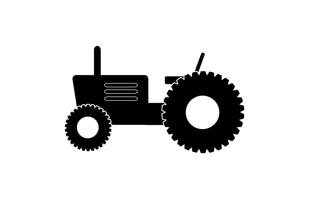 This features a black and white illustration of a tractor, showcasing its large back wheels. This iconic symbol is often associated with agriculture and farming, as it represents the primary means of transporting goods and equipment on rural properties. The simplicity of the design highlights the essential components of the tractor, making it easily recognizable to those familiar with such machinery.