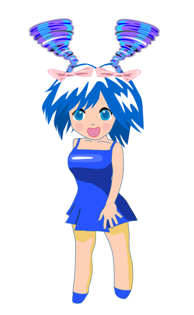 This features a cartoon character, possibly a girl or a woman, wearing a blue dress and a bow in her hair. She is standing with one hand on her hip and the other hand pointing upwards, giving off an energetic vibe. Her outfit appears to be a mix of casual and formal elements, as she has shorts on underneath her skirt. The character's expression suggests that she might be playful or expressive in nature.