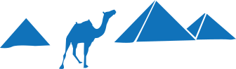 This features a camel standing in the desert, with three blue pyramids in the background. The camel is positioned towards the left side of the scene and appears to be walking across the sandy terrain. The pyramids are arranged in a triangular formation, with one on the far left, another in the middle, and the third on the right side of the image. This unique combination of elements creates an interesting visual contrast between the desert landscape and the man-made structures.