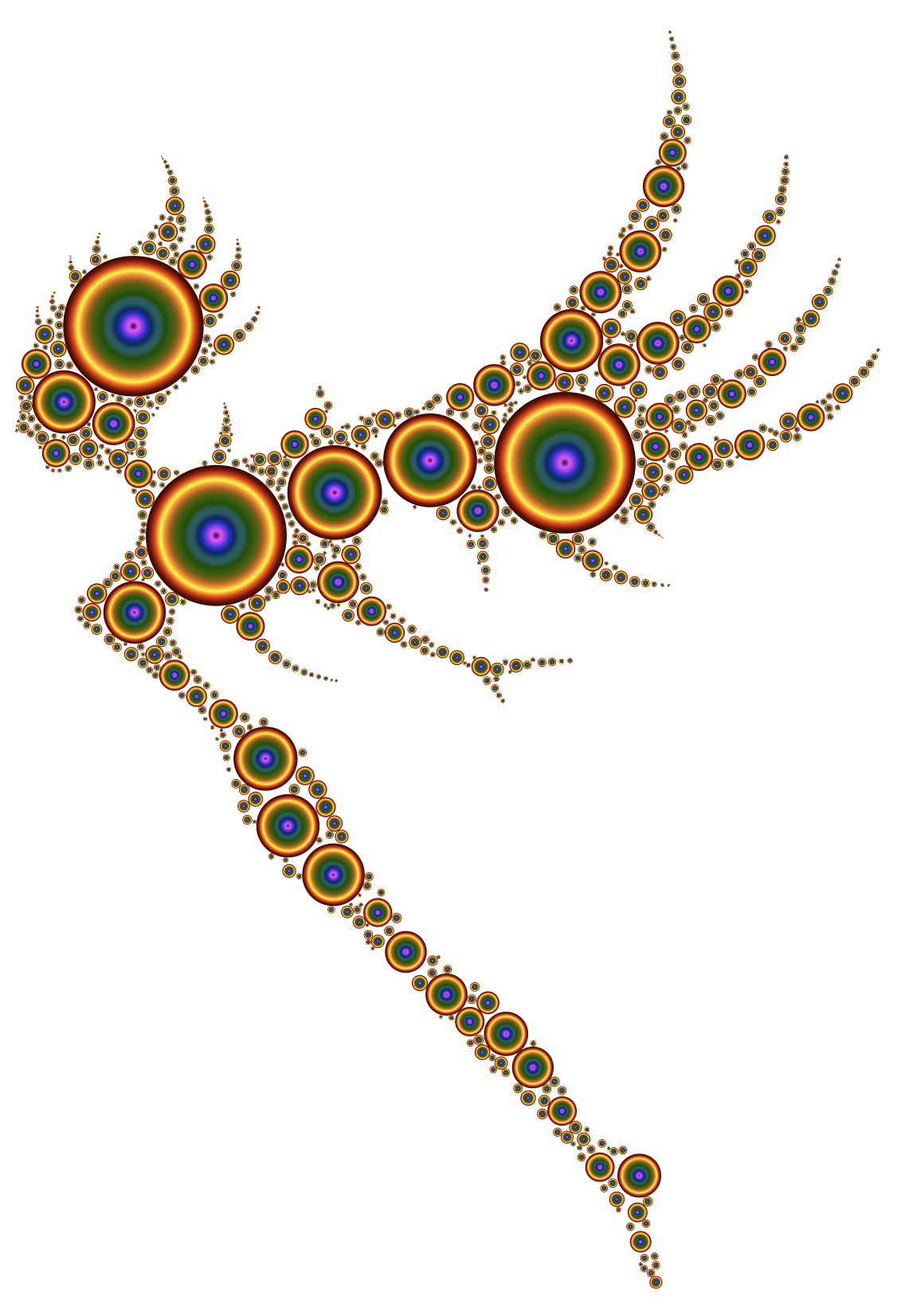 This features a colorful and intricate design of an angelic creature with wings. The wings are adorned with various circles, creating a visually striking pattern. The overall composition is quite complex, with the wings extending outwards from the center of the image. The colors used in this artwork are vibrant and eye-catching, making it an appealing piece for viewers to appreciate.