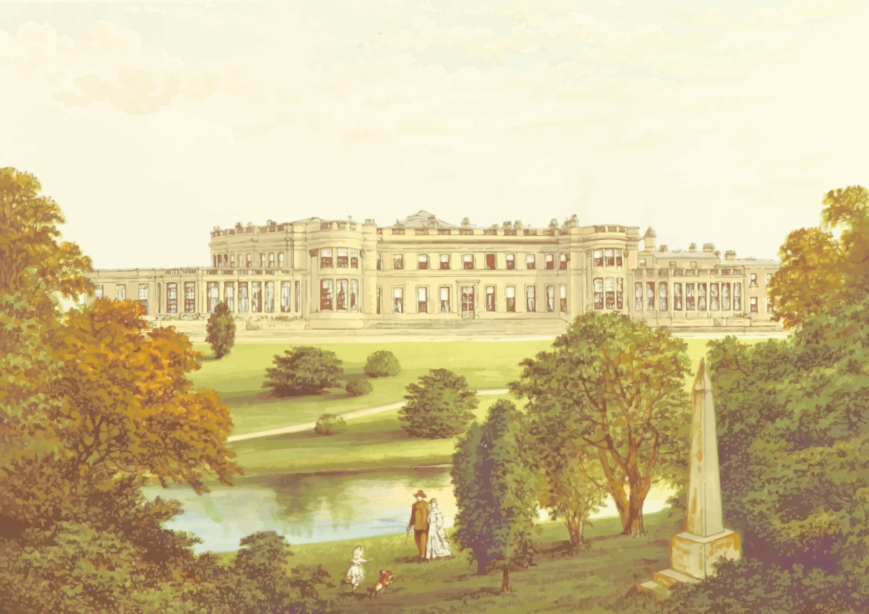 This is a painting of an old, large mansion with many windows and columns. It appears to be situated in the middle of a park or garden setting. There are several people walking around the area, enjoying the beautiful surroundings. Some of them have dogs accompanying them on their walk. In total, there are five people visible in the painting, each engaged in different activities and exploring the grounds. The presence of these individuals adds a sense of life to the otherwise static scene.