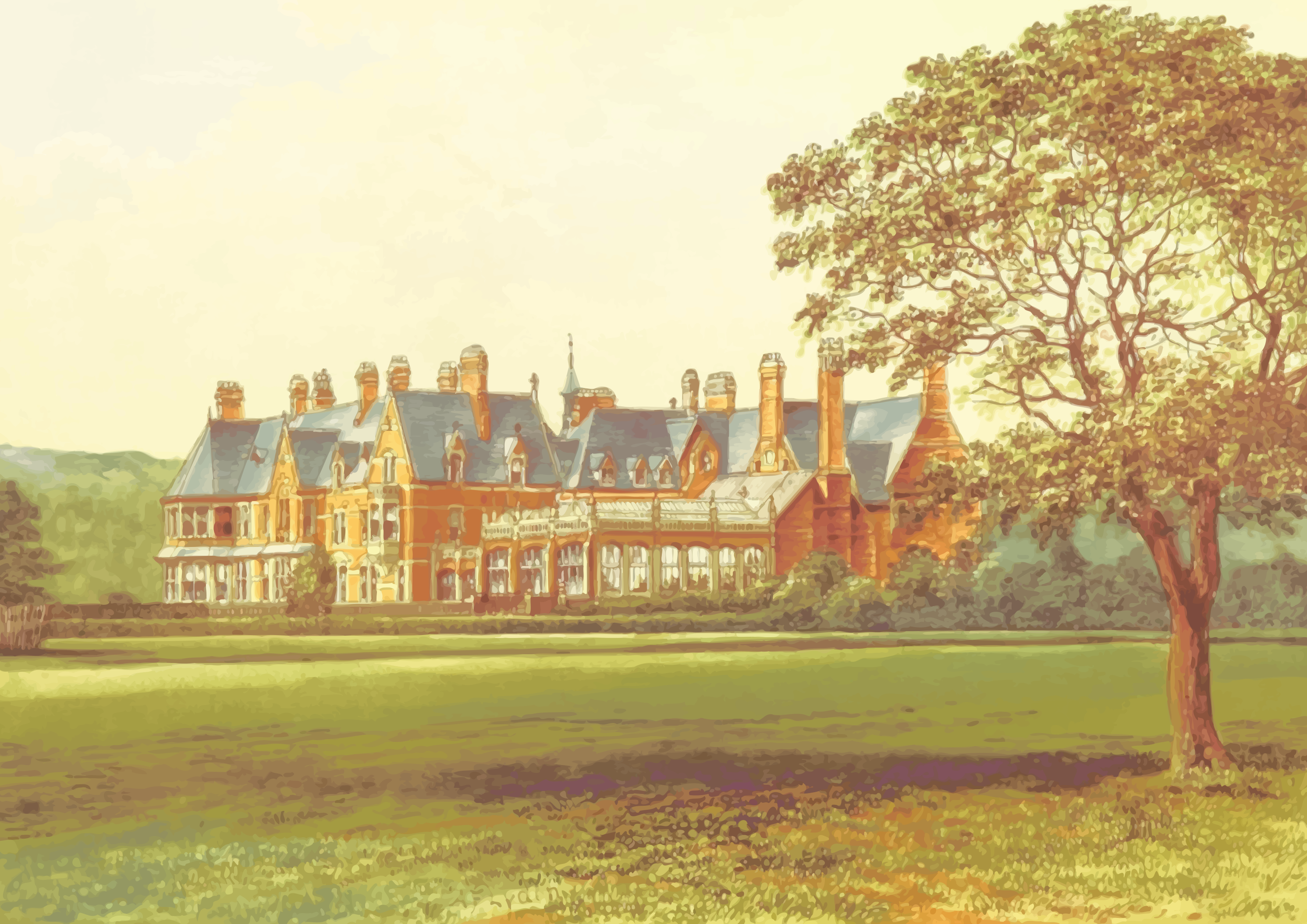 This is a painting of an old, large house with many windows. It appears to be a mansion or a castle-like structure, surrounded by trees and grass. The building has a red brick exterior, giving it a classic and elegant appearance. In the foreground, there are two trees that provide shade and contrast to the scene. The painting is in black and white, which adds an artistic touch to the image. Overall, the painting captures the beauty of the old house and its surroundings, evoking a sense of history and timelessness.