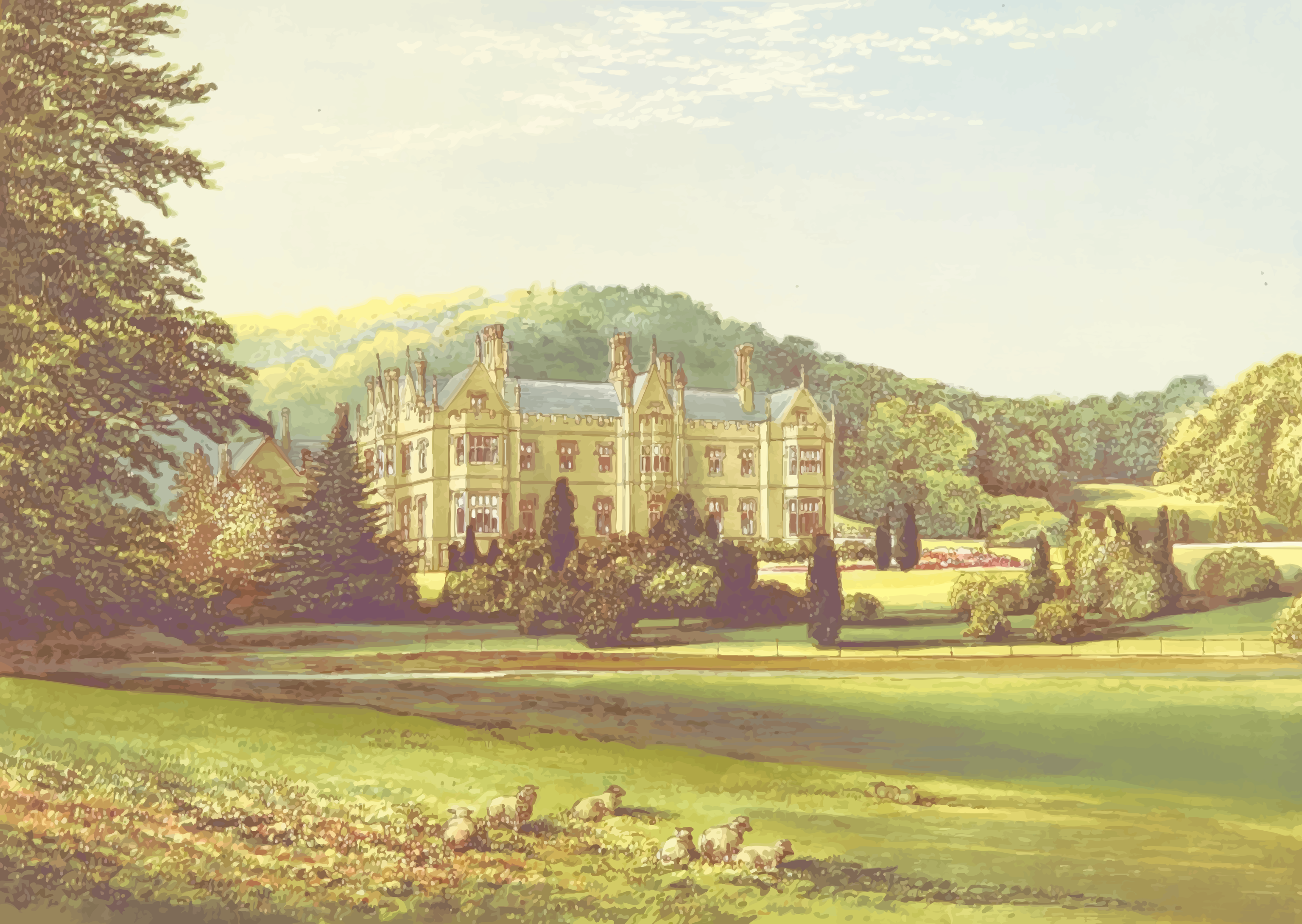 This is a painting of an old, large country house with a castle-like appearance. It sits on top of a hill overlooking a lush green field and a forest in the background. The house has several chimneys and appears to be surrounded by trees. In addition to the main building, there are two smaller buildings visible in the scene. The painting also features numerous sheep scattered throughout the field below the house. Some of these sheep can be seen closer to the foreground while others are further away, creating a sense of depth in the image. The overall atmosphere is serene and picturesque, showcasing the beauty of the countryside.