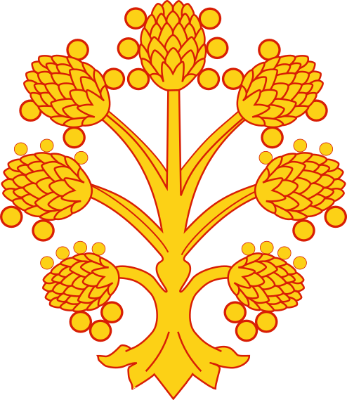 This features a beautifully designed emblem with an intricate pattern of yellow and orange flowers. The flowers are arranged in various positions, creating a visually appealing composition. There is a central flower surrounded by smaller ones, giving the impression of a floral bouquet. The design appears to be inspired by nature, as it showcases the beauty of flowers in their natural habitat. Overall, this emblem exudes a sense of elegance and sophistication, making it an attractive piece for display or use in various contexts.