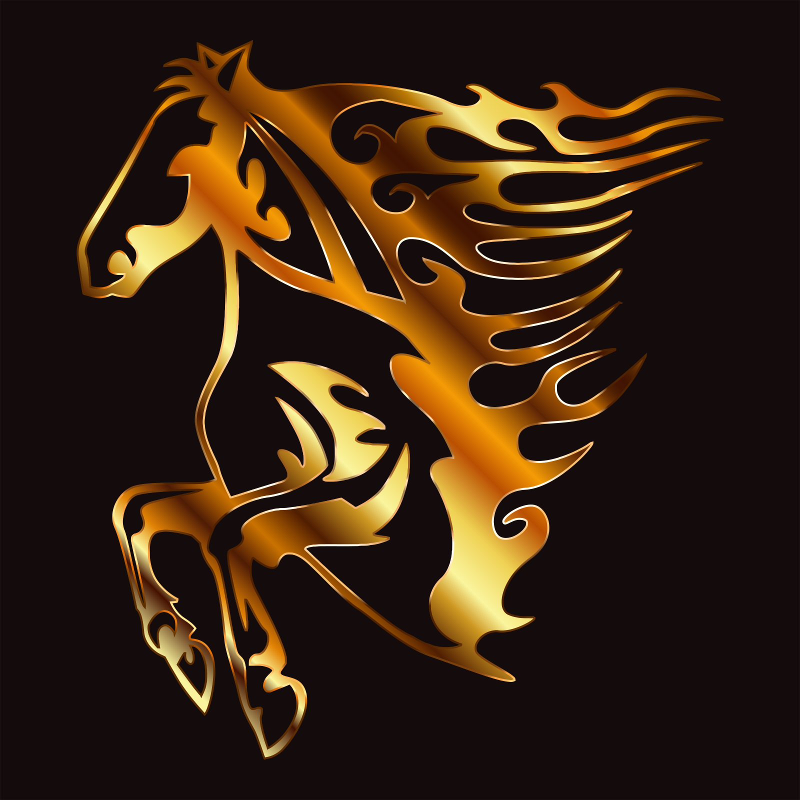 This features a beautifully crafted golden horse with intricate designs on its body. The horse is positioned in the center of the frame, and its head is turned to the left. The design elements on the horse's body are reminiscent of flames, giving it an elegant and artistic appearance. The overall effect is a captivating representation of a majestic creature that stands out against the dark background.