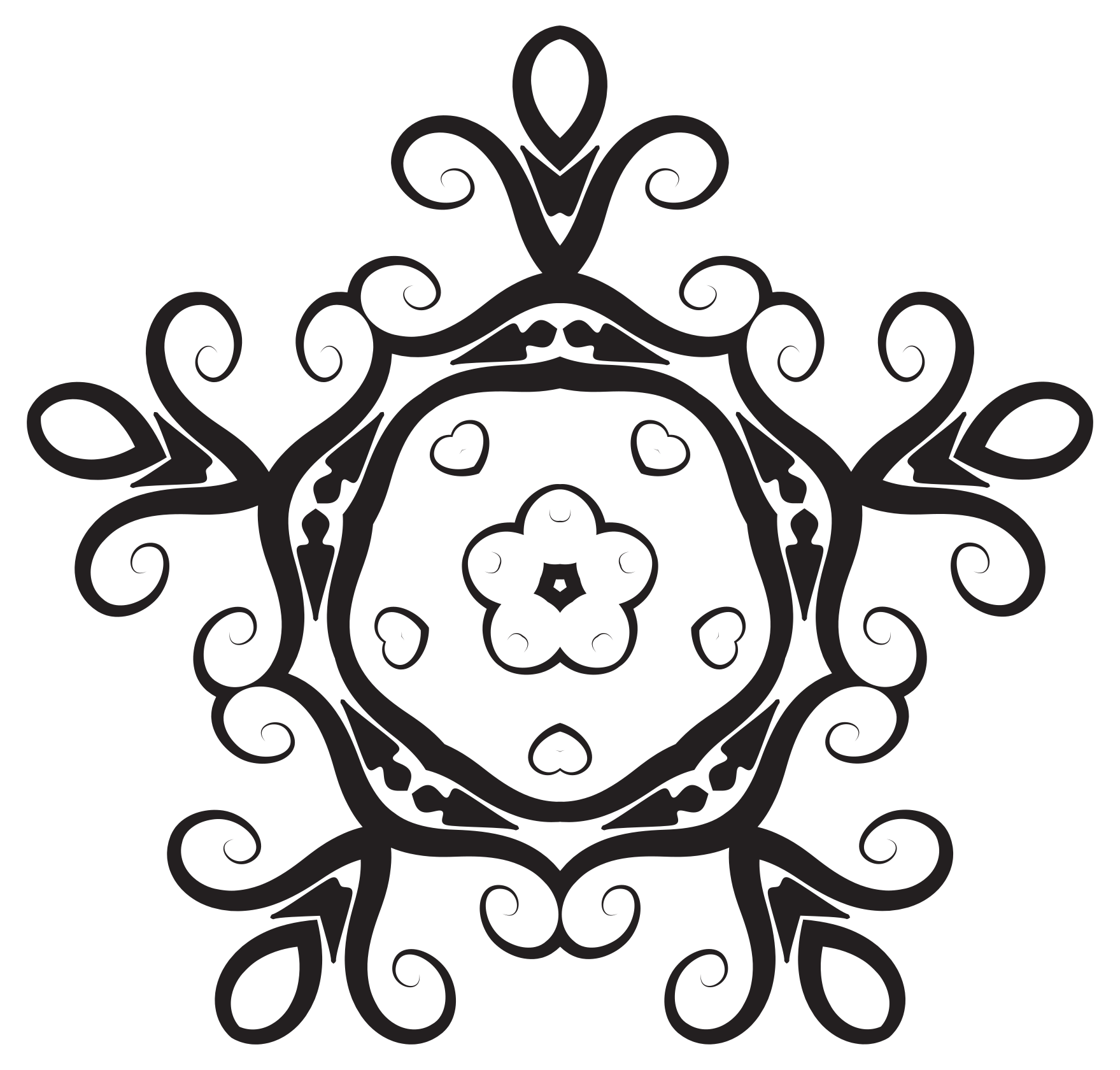 This features a black and white design of an ornate floral pattern. The centerpiece of the design is a large, round flower with a small dot in its center. Surrounding this central flower are several smaller flowers, creating a visually appealing composition. The intricate patterns and shapes within the design give it a decorative and artistic appearance.