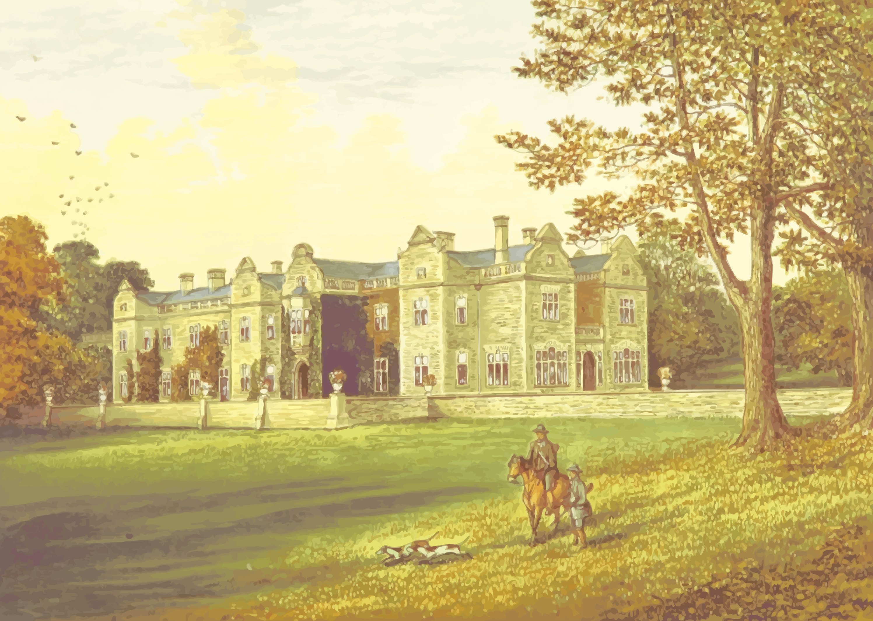Tags: ancestral, ancestry, architecture, britain, building, home, house, mansion, stately, uk, drawing, painting, artwork, castle, estate, manor, horse, rider, tree, leafe, yellow, orange, green, brown, white, gray, thorpe brantingham