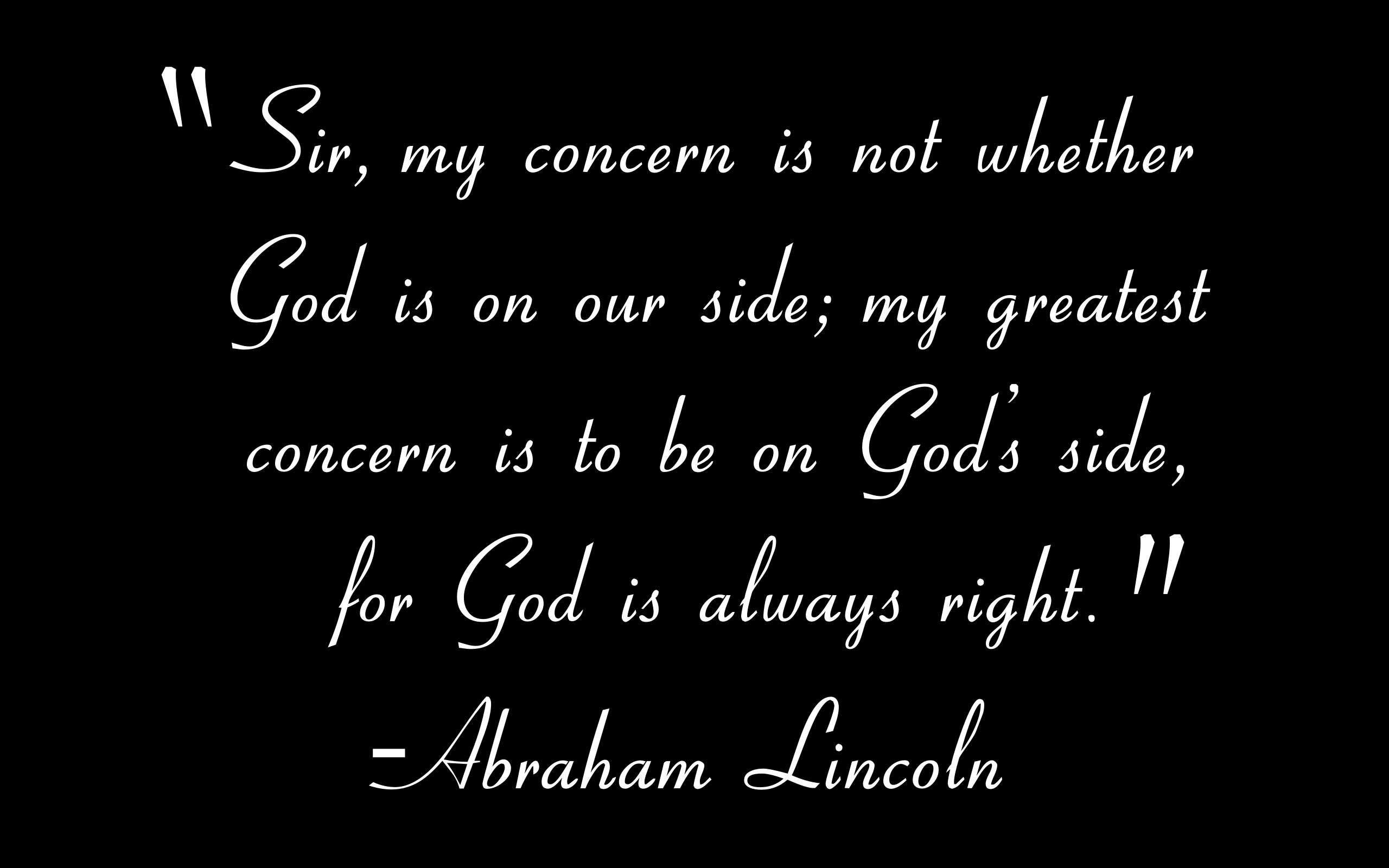 This features a quote from Abraham Lincoln, who is known for his wisdom and leadership. The quote reads "Sir, my concern is not whether God is on our side; my greatest concern is to be on God's side." This statement reflects the importance of living a life that aligns with one's faith and values. The quote is displayed in white text against a black background, which creates a striking contrast between the words and the background.