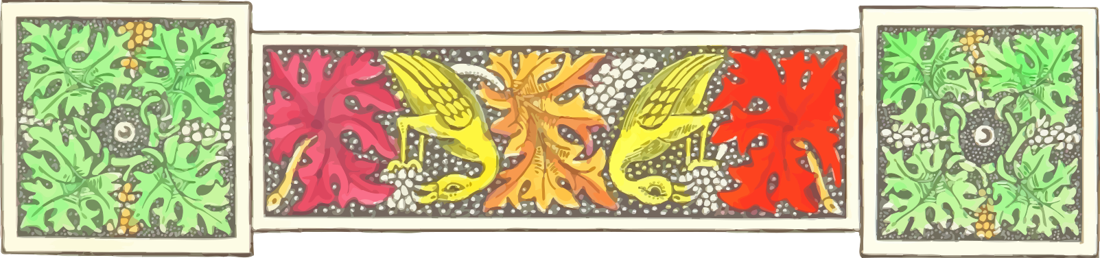 This features a decorative border with two birds, one on the left and another on the right. These birds are positioned above a design that includes red, yellow, green, and orange colors. The birds appear to be flying or perched in the middle of the border. The overall scene is quite colorful and visually appealing.