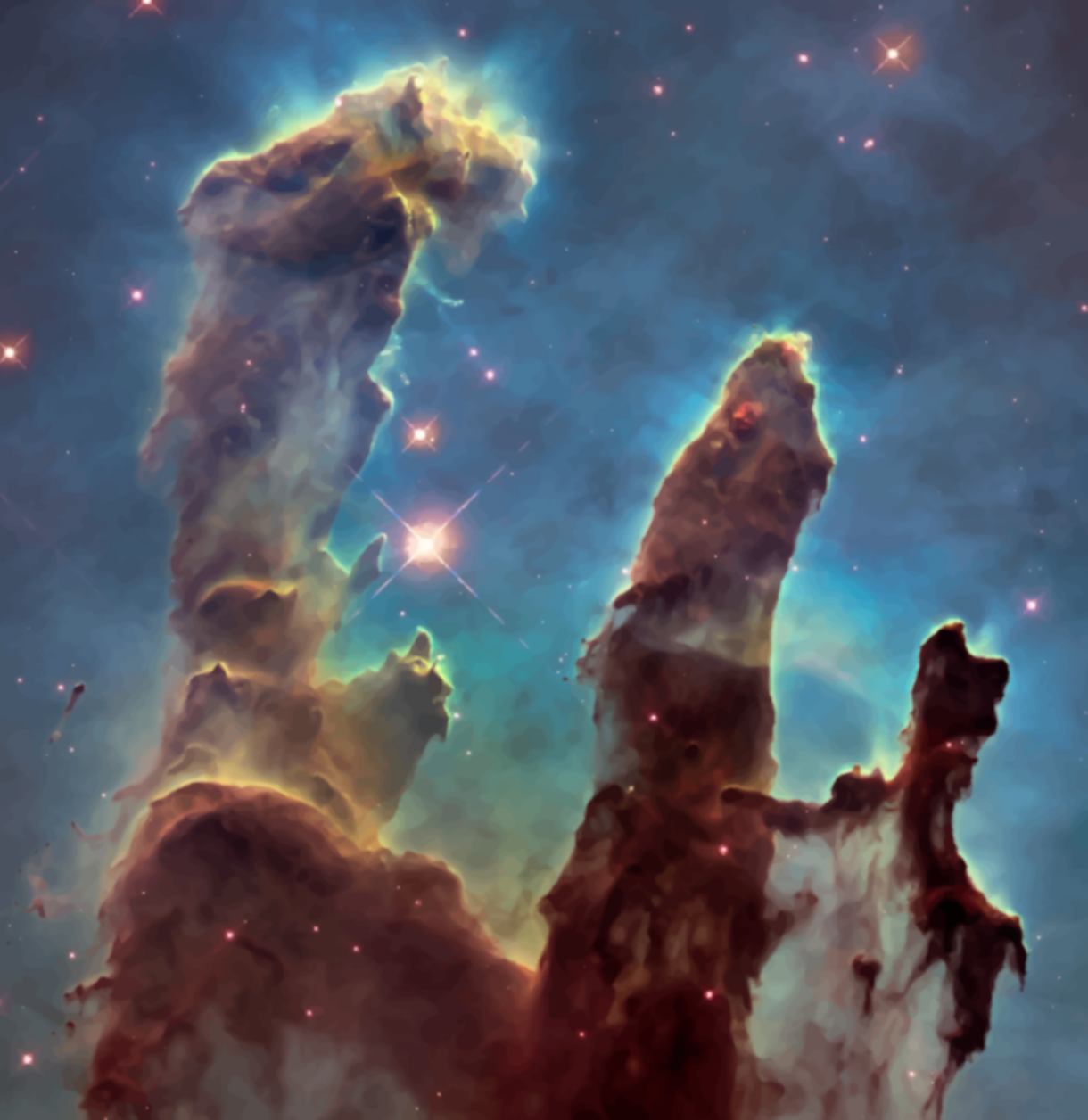 This features a vibrant and colorful space scene with three large, glowing pillars standing out against the backdrop. These pillars are adorned with bright colors, giving them an otherworldly appearance. In addition to the pillars, there is a cluster of stars surrounding them, adding to the celestial atmosphere. The overall composition creates a sense of wonder and exploration, as if we are witnessing the birth of a new universe or discovering hidden secrets within our own.