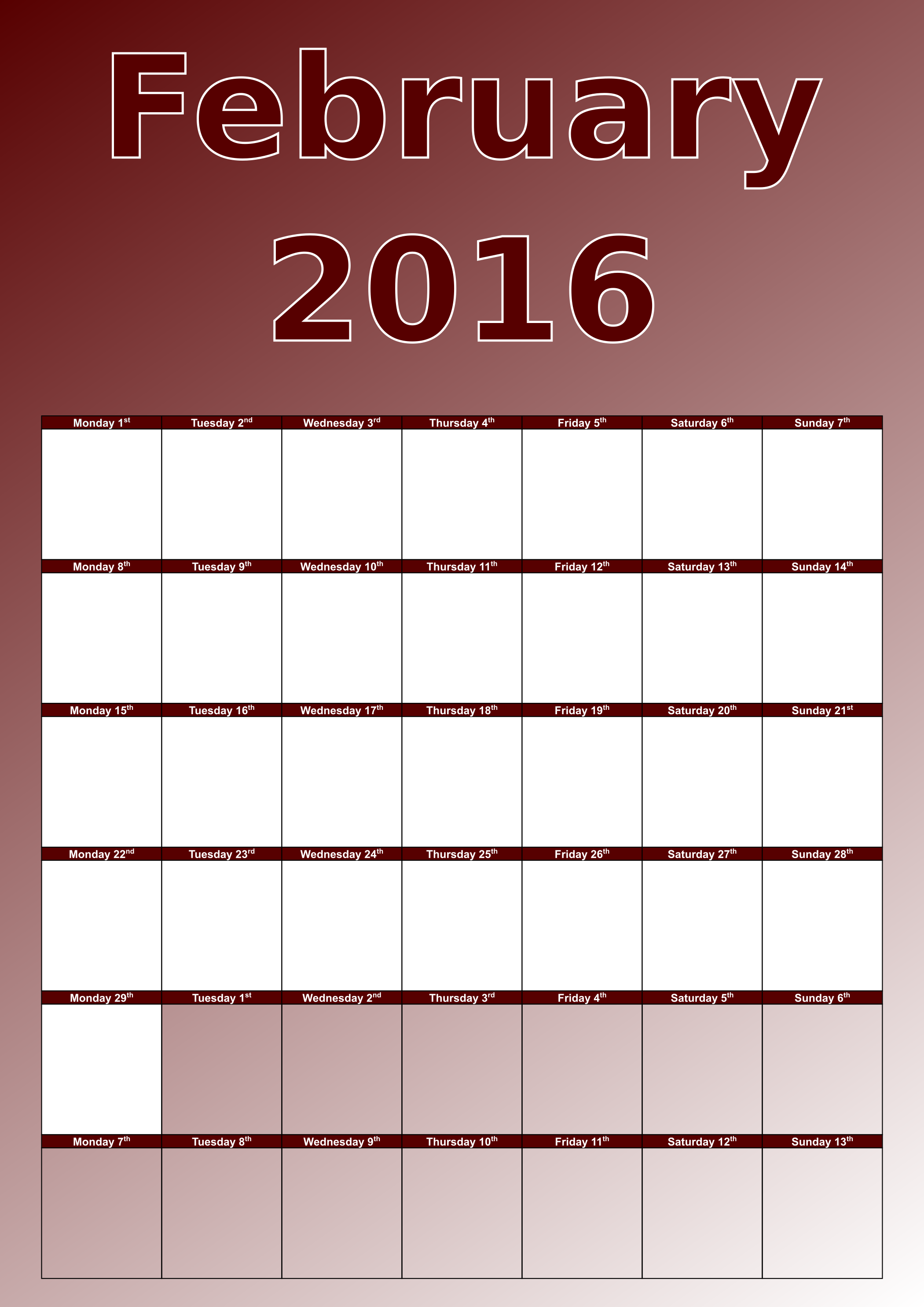 This is a completely free image February 2016 Calendar that you can download, post, and use for any purpose.