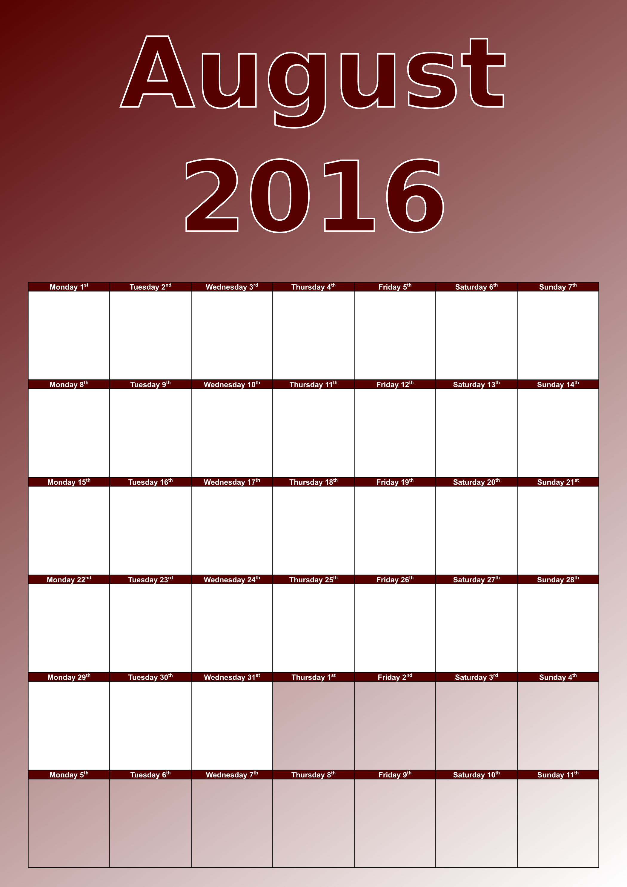 This features a calendar for the month of August 2016. It is a large, white calendar with red and black text that reads "August 2016." The calendar has a clean and simple design, making it easy to read and understand. The layout of the calendar is organized in such a way that each day of the month is clearly marked, allowing users to easily plan their schedules for the upcoming month.