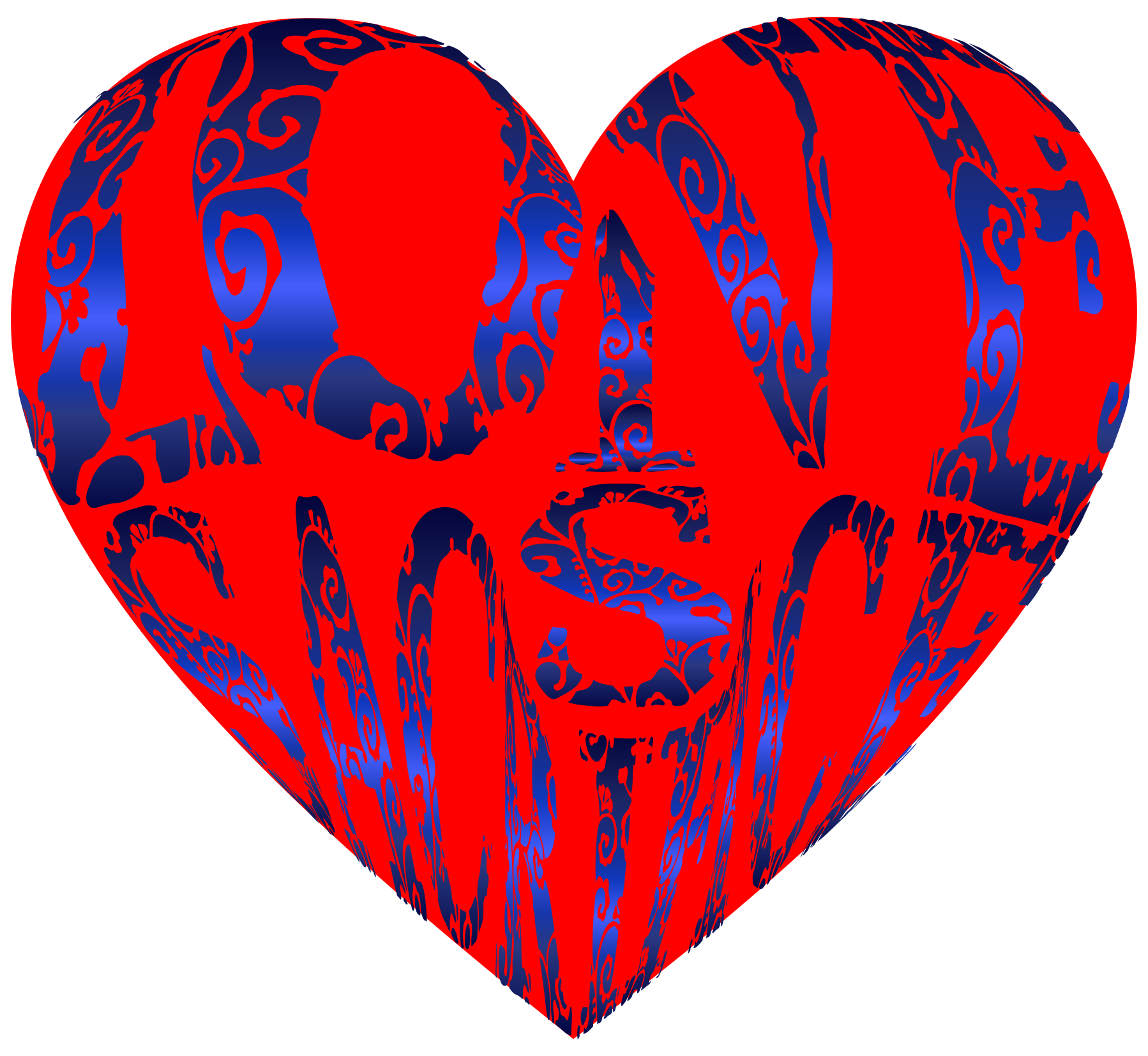 This features a large, red heart with the word "love" written on it. The heart is made up of various shapes and patterns, giving it an interesting and unique appearance. The word "love" is displayed in different colors, including blue, red, and white, adding to its visual appeal. Overall, this artistic design creates a striking and eye-catching piece that captures the essence of love.