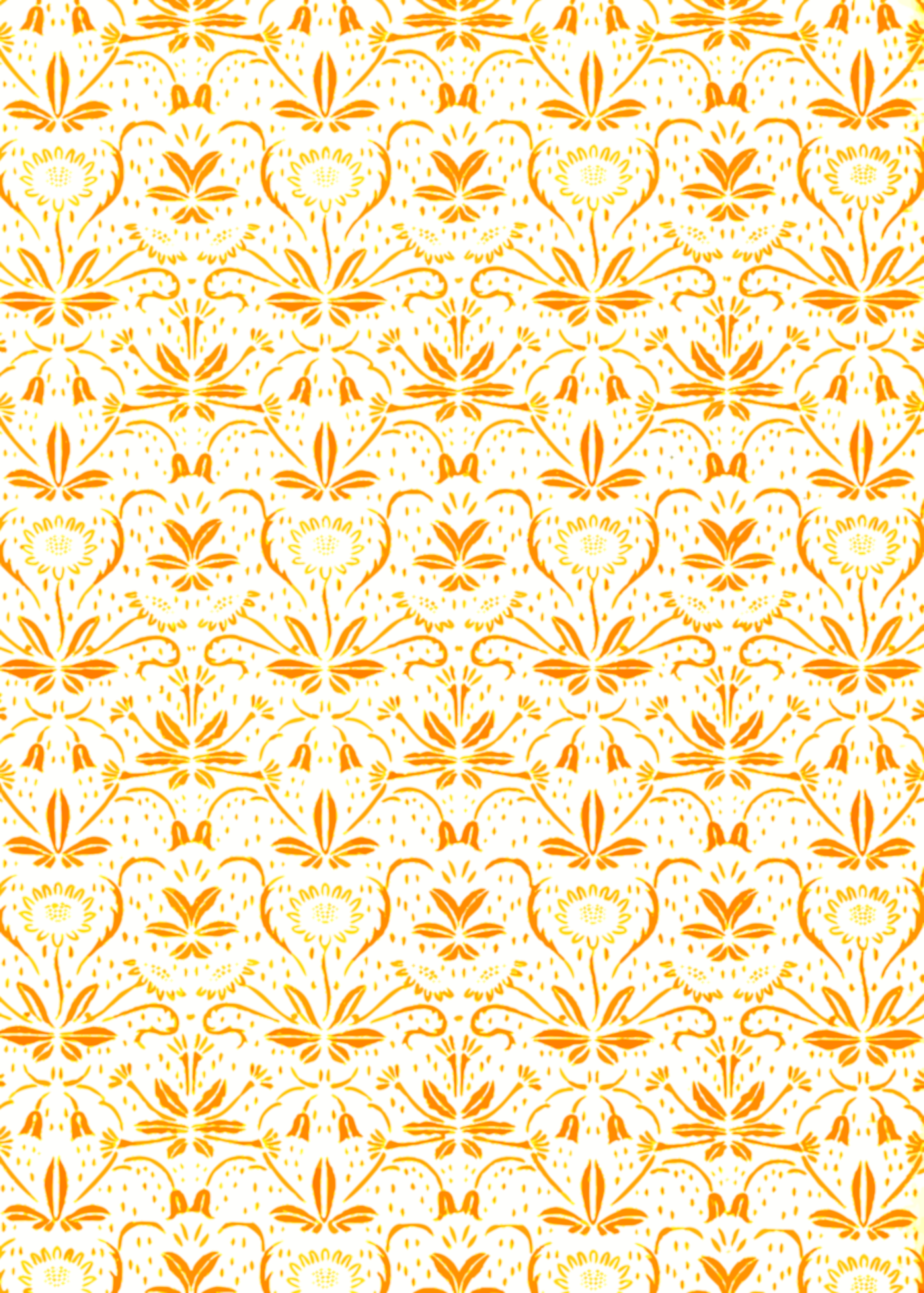 This features a patterned wallpaper with an orange and yellow color scheme. The wallpaper is adorned with a floral design, including various flowers in different sizes and shapes. These flowers are scattered throughout the scene, creating a visually appealing and vibrant atmosphere. The combination of the orange and yellow hues adds warmth to the overall design, making it an attractive choice for interior decoration.