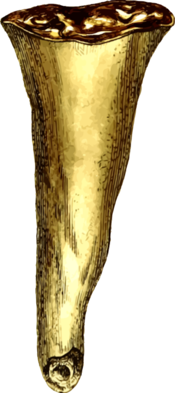 This features a large, golden horn or trumpet that is prominently displayed in the foreground. This horn appears to be made of metal and has an antique appearance. It seems to be the main focus of the image, with no other objects or people visible in the background. The horn's shape and size make it a striking visual element within the scene.