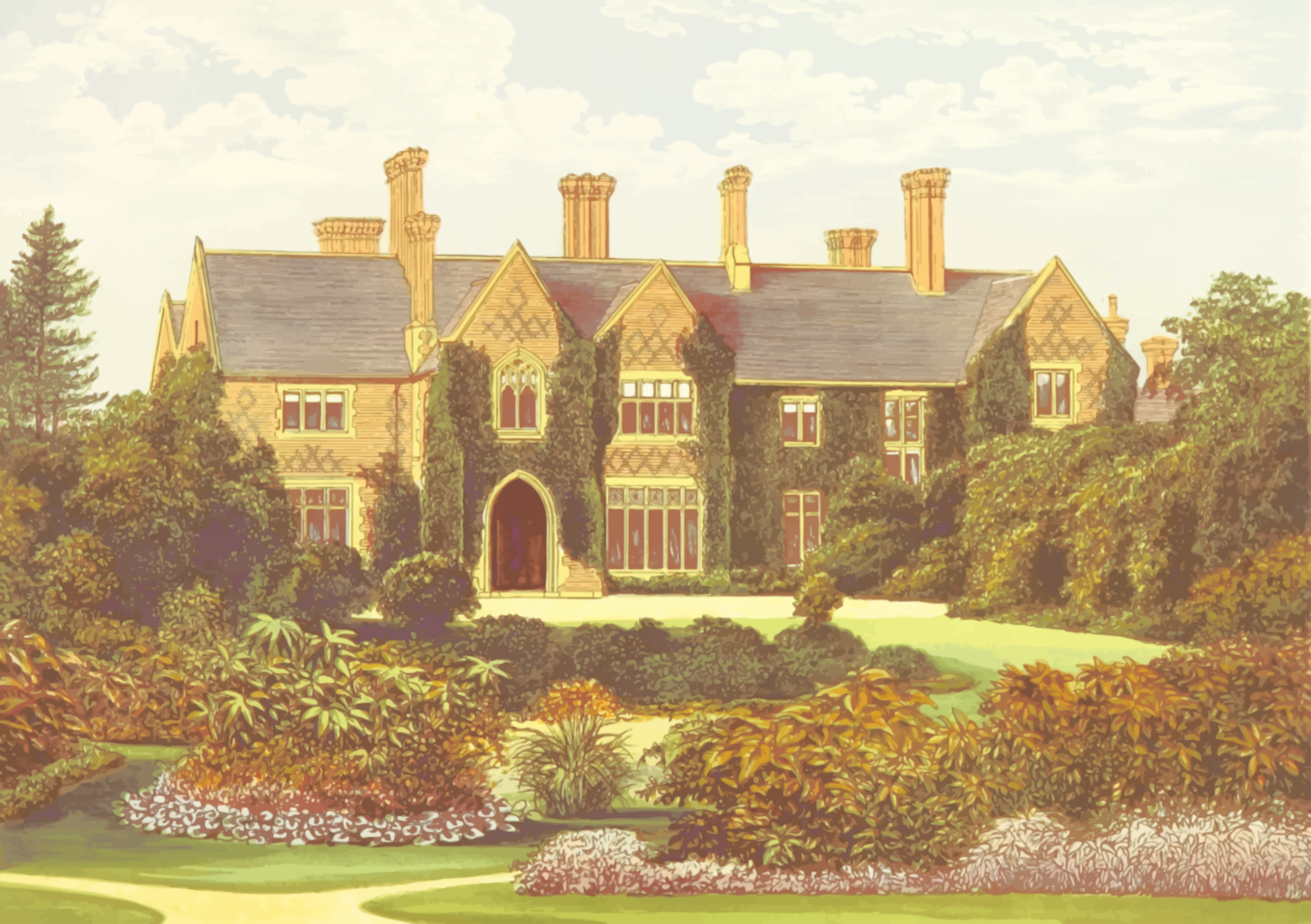 This features a large, old-fashioned brick house with many windows and chimneys. It is situated on top of a hill, surrounded by lush greenery and trees. A beautiful garden surrounds the house, filled with various plants and flowers. There are several potted plants placed throughout the scene, adding to the overall charm of the property. The house appears to be an old country home, possibly from the 1800s, given its architectural style and the presence of a large brick structure.