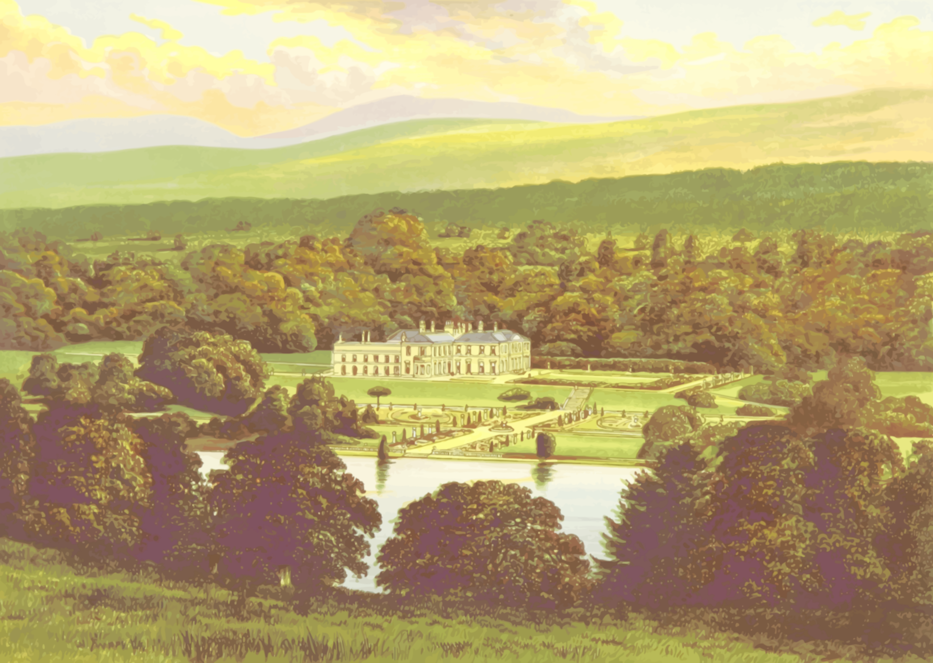 This is a painting of an old country estate, surrounded by trees and a large body of water. The estate features a castle-like building with several towers, giving it a grand appearance. A bridge can be seen crossing the water in front of the house, adding to the picturesque scene. The landscape also includes a lush green field nearby, further enhancing the beauty of the setting.