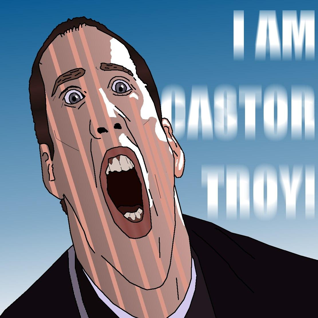 This features a close-up of an animated man's face with his mouth wide open, making it appear as if he is yelling. The man has a beard and mustache, giving him a distinctive look. Above the man's head, there are words that say "I am castor troy," which suggests that this could be an animated version of the character from the movie Face/Off. The image appears to be a comic or cartoon-like representation of the character, capturing his iconic facial expression.