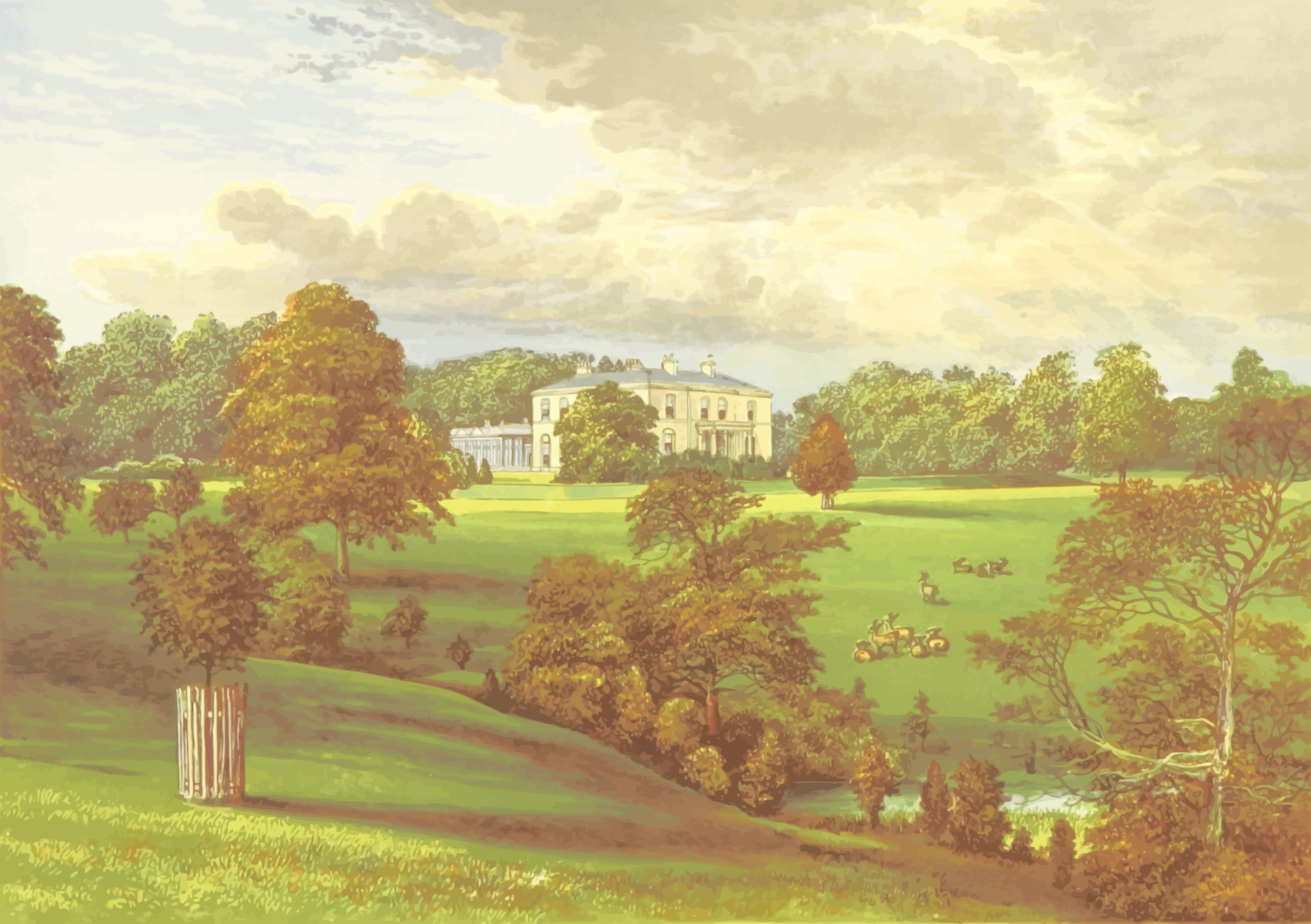 This depicts a beautiful scene of a large mansion situated on top of a hill, surrounded by lush green fields. In the distance, there are several horses grazing in the field, adding to the serene atmosphere. A few people can be seen scattered throughout the scene, likely enjoying the view or attending to their duties around the estate. The combination of the mansion, the horses, and the people creates a picturesque and idyllic countryside setting.