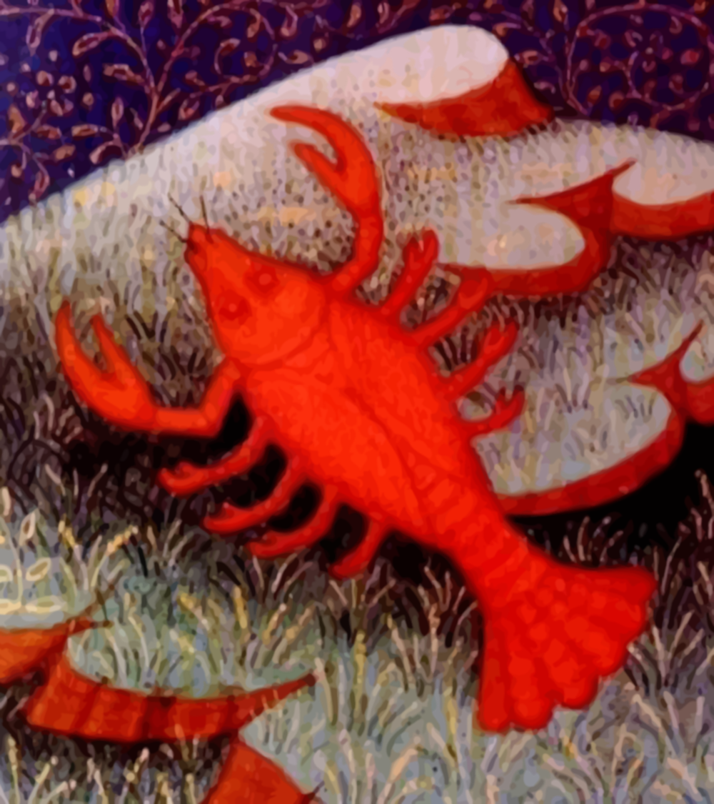 This features a red crab with long, curved claws and an orange body. It is the zodiac symbol for Cancer, which is known as the "crab" in astrology. The crab appears to be walking on grass or possibly climbing up a hillside. In addition to the main crab, there are several other smaller crabs scattered throughout the scene, adding depth and complexity to the image.