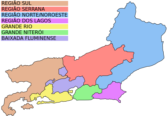 This is a map of the state of Rio de Janeiro, located in Brazil. It shows various regions within the state, including Baixada Fluminense, Grande Rio, Lagos, Noroeste, and Norte. Each region has its own color, making it easy to identify them on the map. The map also includes a key that lists the names of each region, providing additional information for those who may not be familiar with the area. Overall, this map provides a clear visual representation of the state's geography and organization.