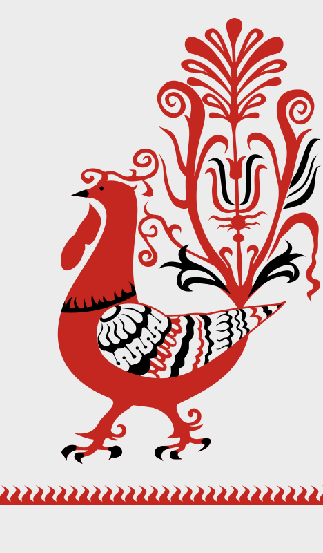 This features a red rooster with intricate designs on its wings and body. It is standing in the center of the scene, surrounded by a floral design that adds to the overall visual appeal. The rooster appears to be walking or running across the image, giving it a dynamic and lively appearance. This artistic representation of a rooster could potentially be used as a heraldic banner for Meisterstadt, showcasing its unique symbolism and craftsmanship.