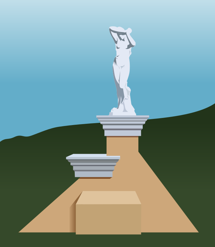 This features a white statue of a person, possibly a Greek god or a human figure, standing on top of a pedestal. The statue is positioned in the middle of an outdoor setting with a hillside visible in the background. The statue appears to be the main focus of the scene, drawing attention due to its size and prominence within the image.