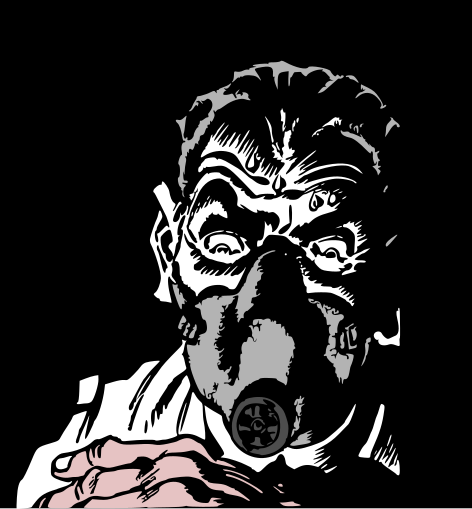 This features a man wearing a gas mask, with his mouth open and eyes wide. He appears to be in distress or discomfort, possibly due to the gas mask he is wearing. The man's facial expression suggests that he might be experiencing some form of danger or hazardous situation. The image has a black background, which further emphasizes the man's emotions and the seriousness of his predicament.