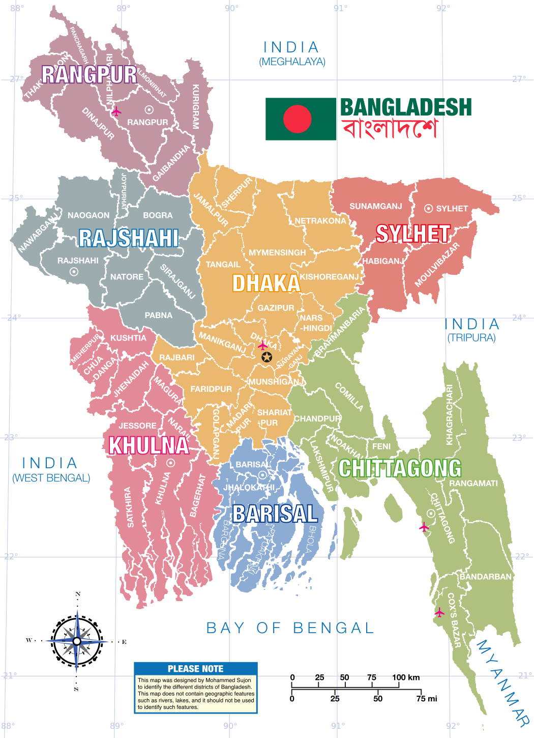 This is a map of Bangladesh, with various districts and cities labeled throughout the country. The map is colorful and features different shades to represent the different regions. In addition to the district names, there are also flags representing the countries of India and Pakistan in the upper left corner of the map. This map serves as a visual guide for those looking to explore or understand the geography of Bangladesh.