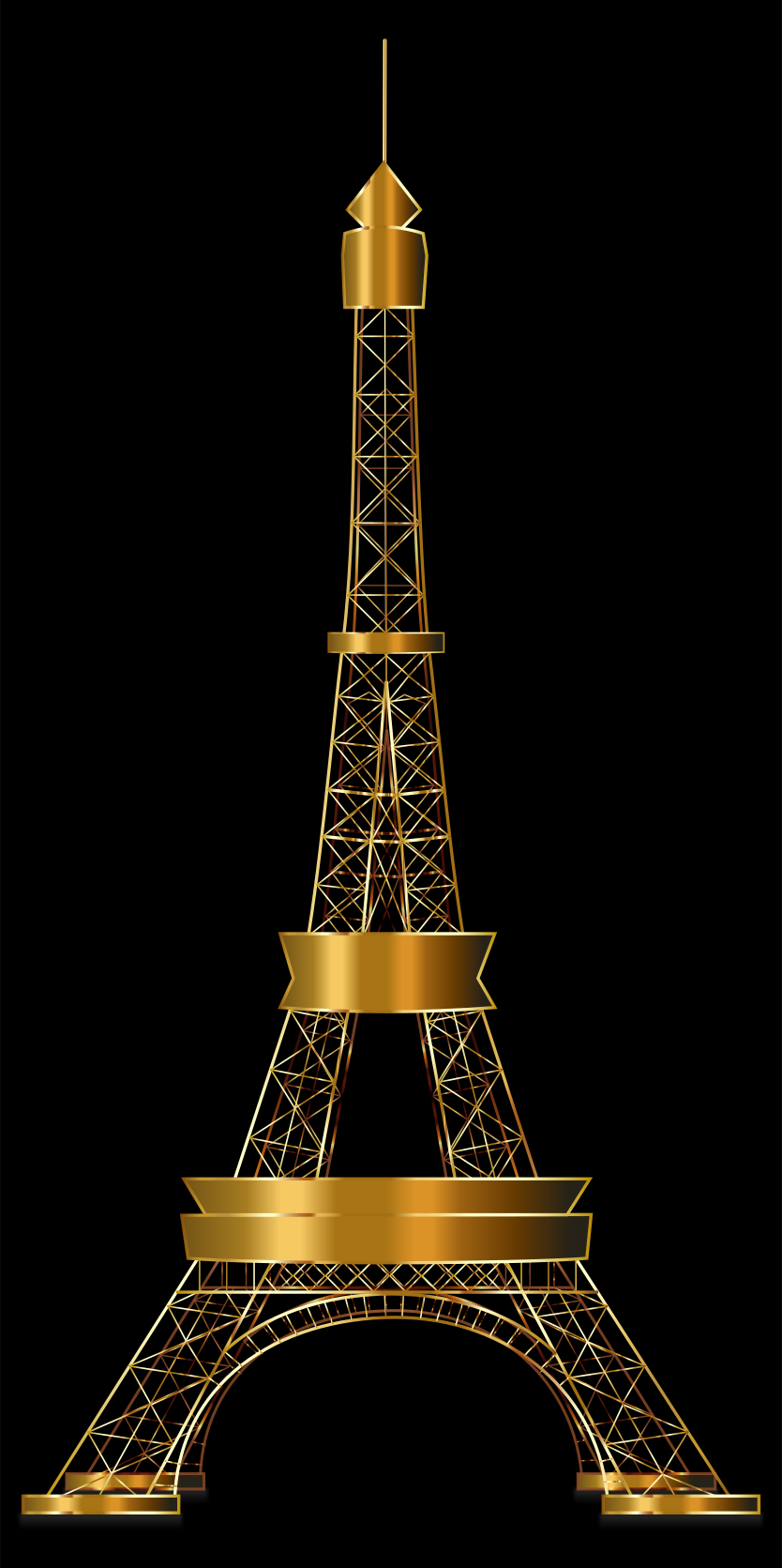 This features a large, golden Eiffel Tower standing tall against a black background. The tower is adorned with gold accents and appears to be made of metal. It stands out as the main focal point in the scene, drawing attention due to its size and striking appearance. The contrast between the dark background and the glistening gold of the Eiffel Tower creates an eye-catching visual effect that highlights the iconic structure's beauty.