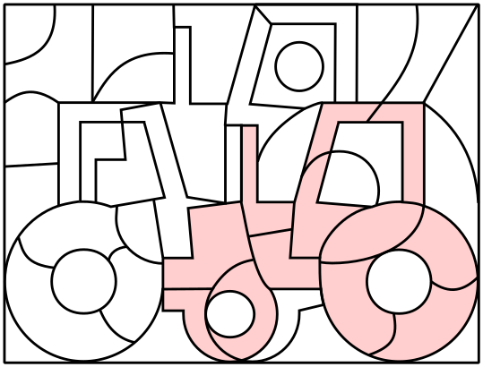 This features a unique and creative design of a tractor made up of various geometric shapes. These shapes are arranged in such a way that they form the outline of a tractor, giving it an artistic appearance. The tractor is composed of multiple circles, with some placed at the front, middle, and back of the vehicle. Additionally, there are several triangles scattered throughout the design, adding depth and complexity to the overall composition. This intriguing piece of artwork showcases a combination of geometric shapes and creativity in its representation of a tractor.