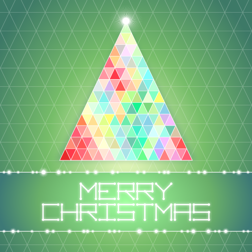 This features a colorful Christmas tree made from rainbow triangles. The tree is adorned with a glowing white circle on top, adding to its festive appearance. The background of the picture consists of green triangles, which further enhances the holiday theme. Underneath the tree are the words "Merry Christmas," indicating that this image was created for the celebration of the season.