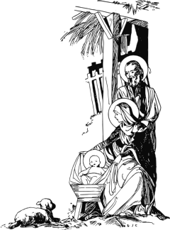 This is a black and white drawing of the Virgin Mary, Joseph, and baby Jesus. They are depicted in a manger scene with a lamb laying in front of them. The Virgin Mary is kneeling down next to her child while Joseph stands behind her. This artistic representation captures the essence of the nativity story and showcases the family's devotion to their faith.