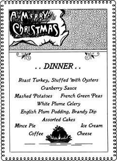 This is a black and white menu for Christmas dinner. It features various dishes such as roast turkey, stuffed with oysters, roast beef, cranberry sauce, French green peas, mashed potatoes, English plum pudding, brandy dip, assorted cakes, ice cream, and cheese. The menu is decorated with a Merry Christmas sign at the top left corner of the page. The dishes are arranged in an organized manner, making it easy for customers to choose their preferred meal options.