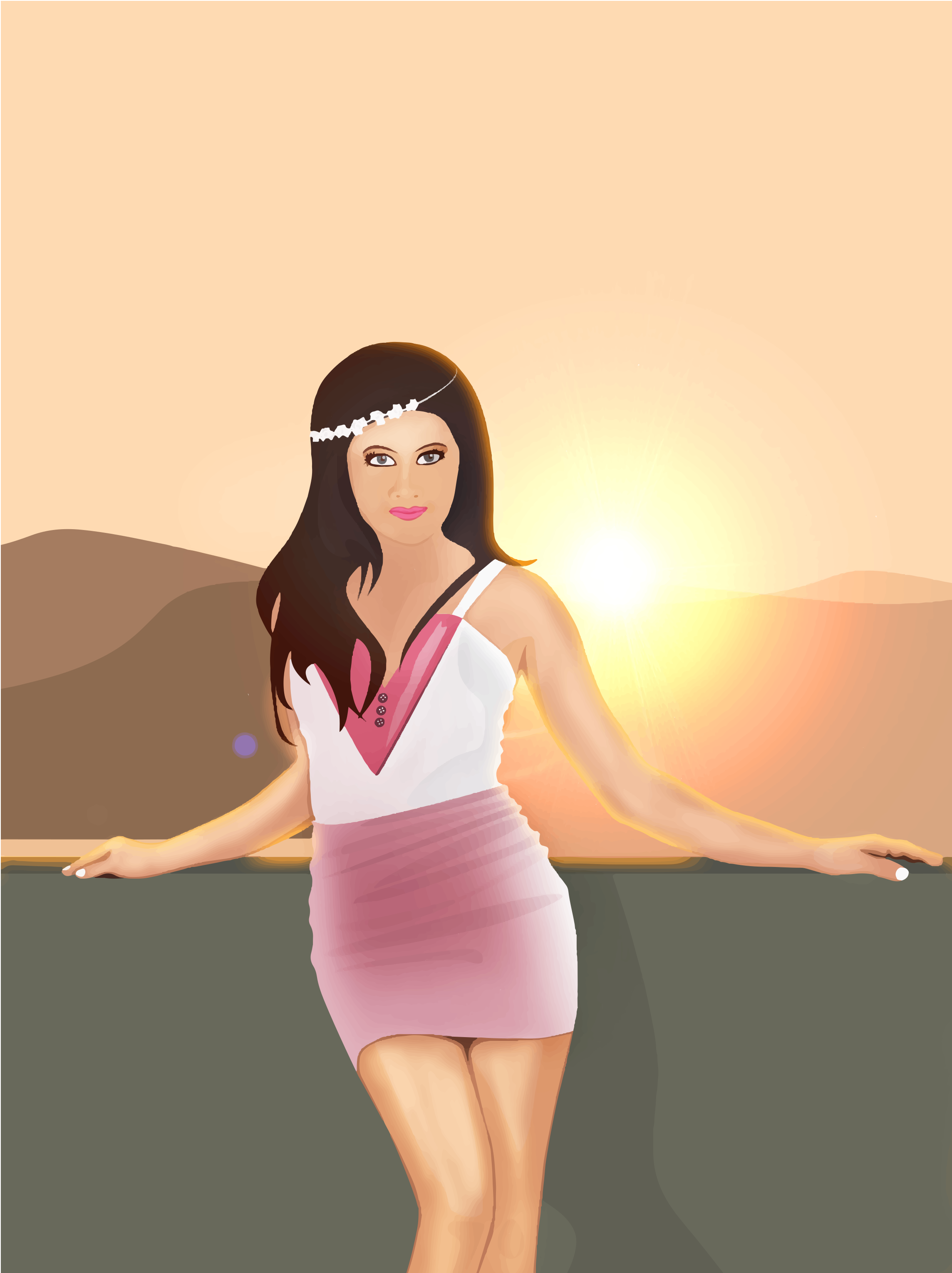 This features a woman wearing a white dress, standing on the edge of a cliff. She is posing for the camera with her hands on her hips and appears to be enjoying the view. The sun is setting in the background, casting a warm glow over the scene. The woman's outfit and the picturesque backdrop create an atmosphere of relaxation and leisure.