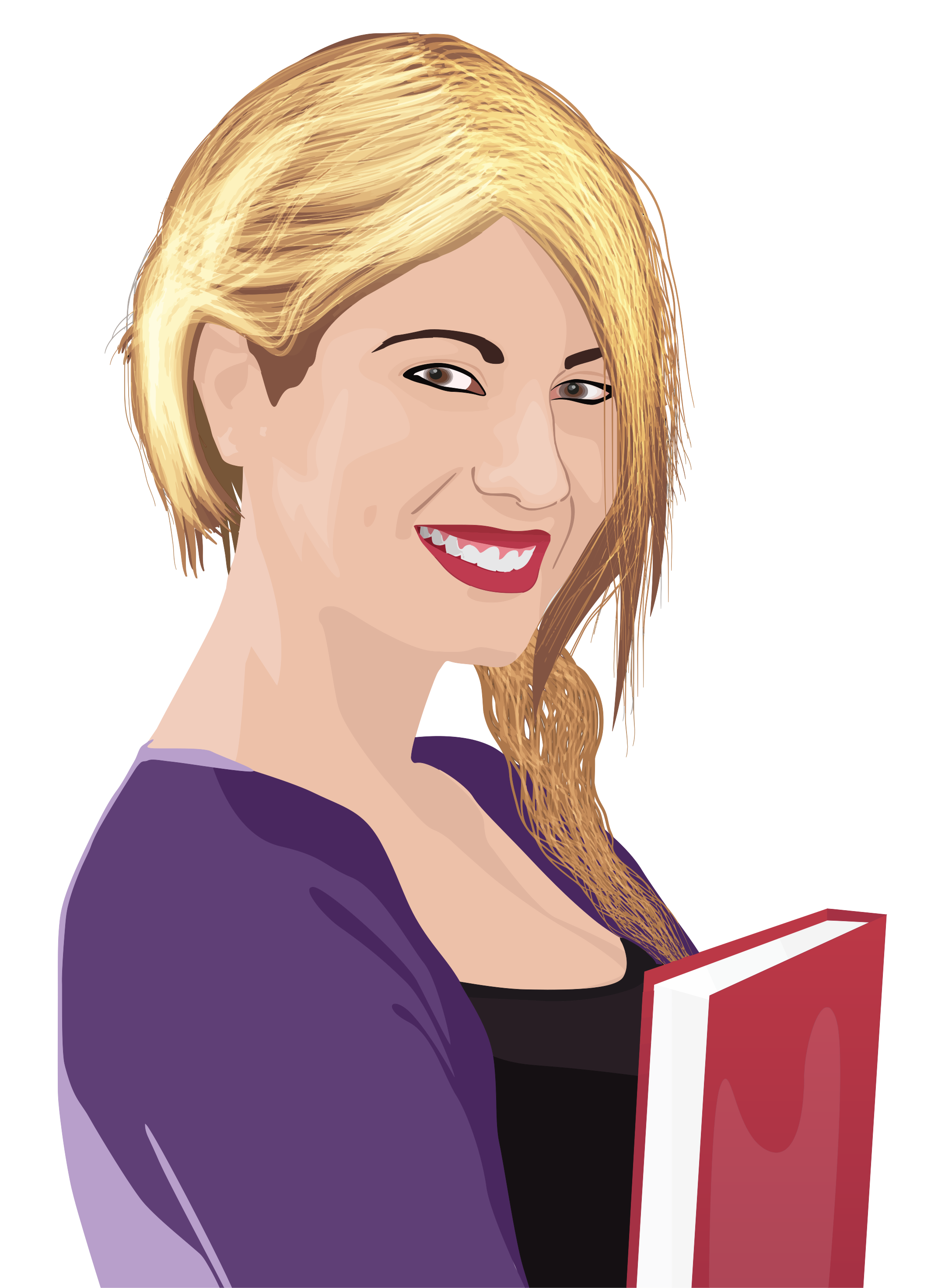 This features a woman with blonde hair, wearing a purple shirt and holding a red book. She is smiling brightly for the camera, displaying her teeth in a wide grin. Her outfit includes a black top that complements her overall appearance. The woman appears to be confident and happy as she poses for the picture with the book in hand.