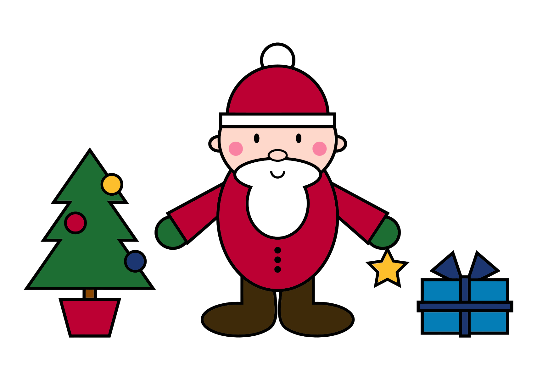 This features a colorful cartoon Santa Claus standing next to a Christmas tree. He is wearing a red and white outfit, with a green hat on his head. In his hand, he holds a star-shaped ornament. The scene also includes two presents, one located near the bottom right corner of the image and another at the top left corner. A potted plant can be seen in the background, adding to the festive atmosphere.
