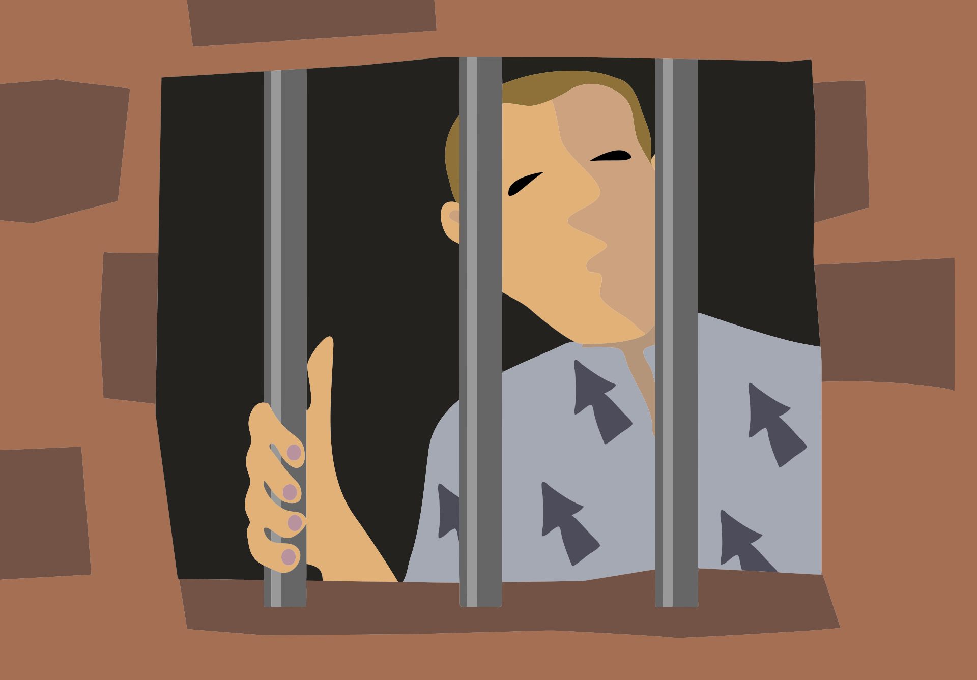 This features a man wearing a Hawaiian shirt, standing in front of a brick wall. He is holding up his hand and looking out from behind bars, giving the impression that he might be in jail or confined to some sort of space. The man's expression appears somewhat sad as he looks at something beyond the bars. The scene has an artistic quality to it, with the man being depicted in a cartoon-like manner.