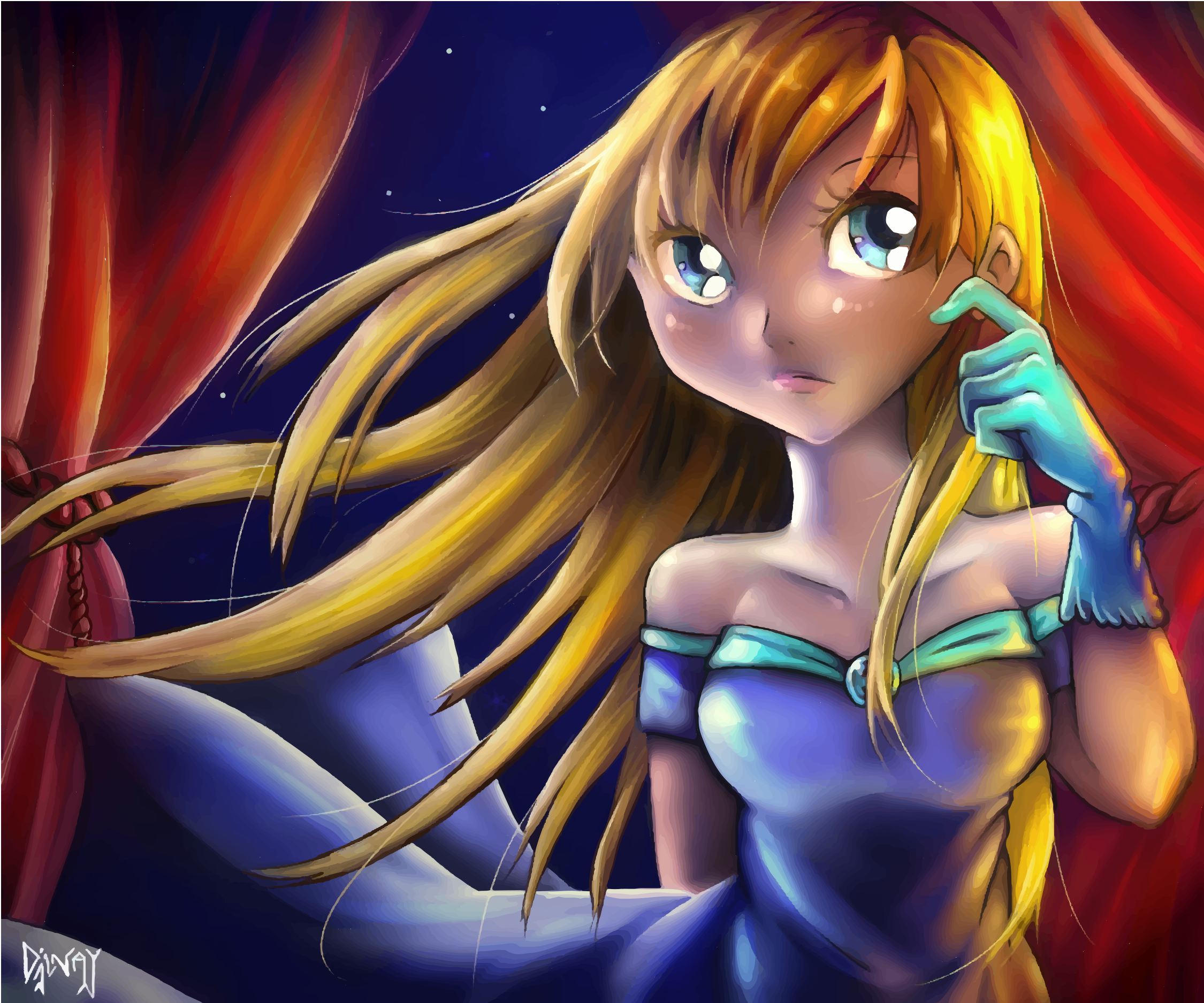 This features a young woman with long blonde hair, wearing a blue dress and holding her finger under her nose. She appears to be in a theatrical setting, possibly on stage or in front of a curtain. Her outfit suggests that she might be playing a character from a fairy tale or other fantasy story. The woman's expression is somewhat serious as she looks at something off-camera, adding an element of intrigue to the scene.