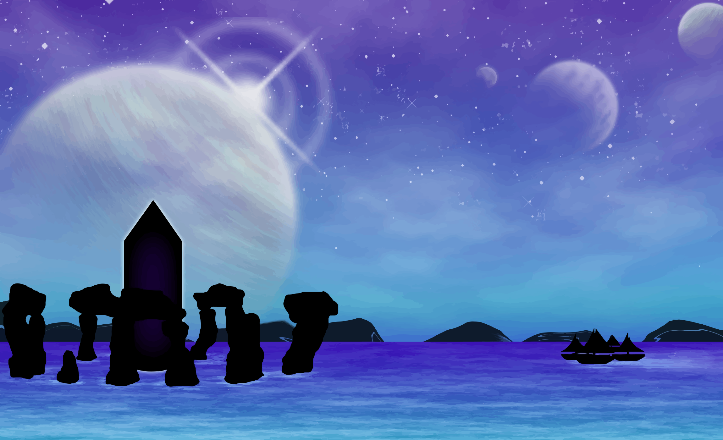 This features a beautiful scene of the ocean with several large rocks scattered throughout. In the center of these rocks, there is an impressive tower-like structure that stands out against the backdrop of the night sky. Above this unique formation, two planets can be seen floating in the sky, adding to the celestial ambiance. Additionally, a boat is visible on the water near the rocks, with several people aboard, possibly exploring or admiring the natural wonder. The combination of the ocean, rocks, and night sky creates an enchanting atmosphere that invites viewers to imagine themselves in this serene environment.