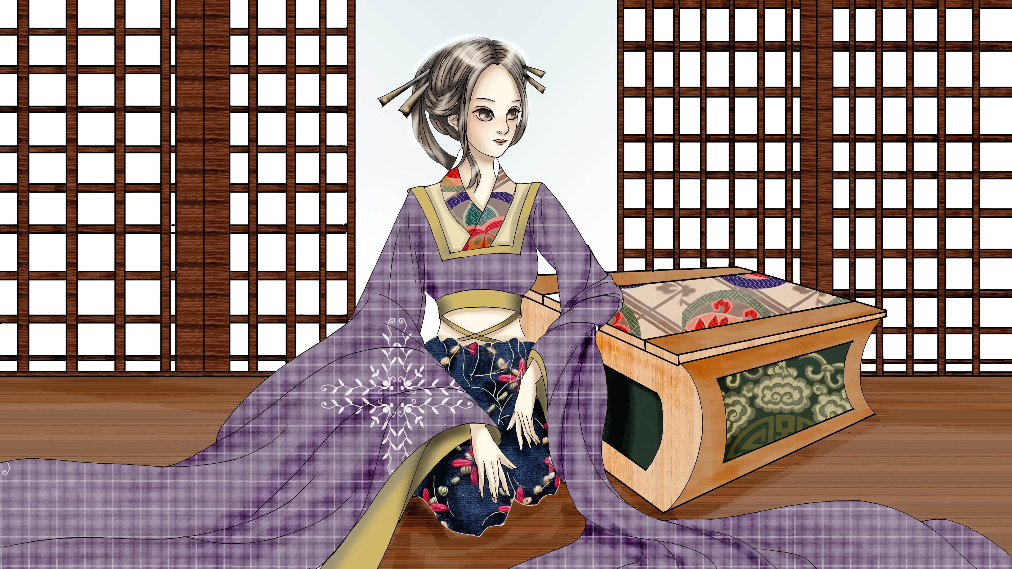 This features a woman dressed in traditional Japanese clothing, sitting on the floor next to an open wooden box. She is wearing a kimono and has her hair tied up in a bun. The woman appears to be holding a small box or container while she sits beside the larger one. The scene takes place in front of a wall with a patterned design, adding to the overall atmosphere of the image.