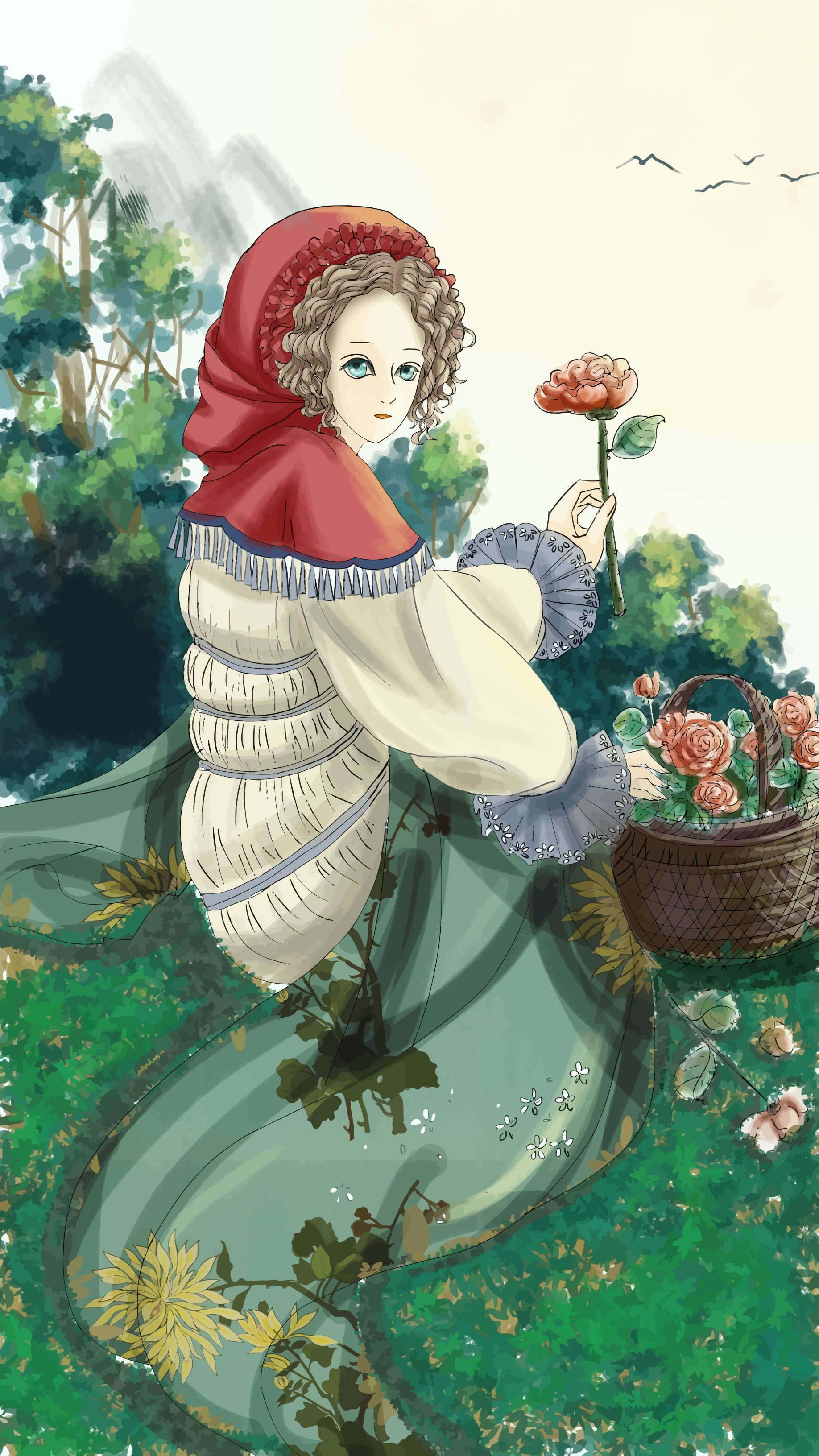 This features a woman dressed in a red hooded outfit, standing next to a basket filled with flowers. She is holding a single rose in her hand and appears to be admiring the bouquet of flowers. There are several other roses scattered around her, adding to the beauty of the scene. In addition to the main subject, there are three birds visible in the background, flying or perched on branches. The overall atmosphere of the image is serene and picturesque, with a focus on the woman's connection to nature and the flowers she holds.
