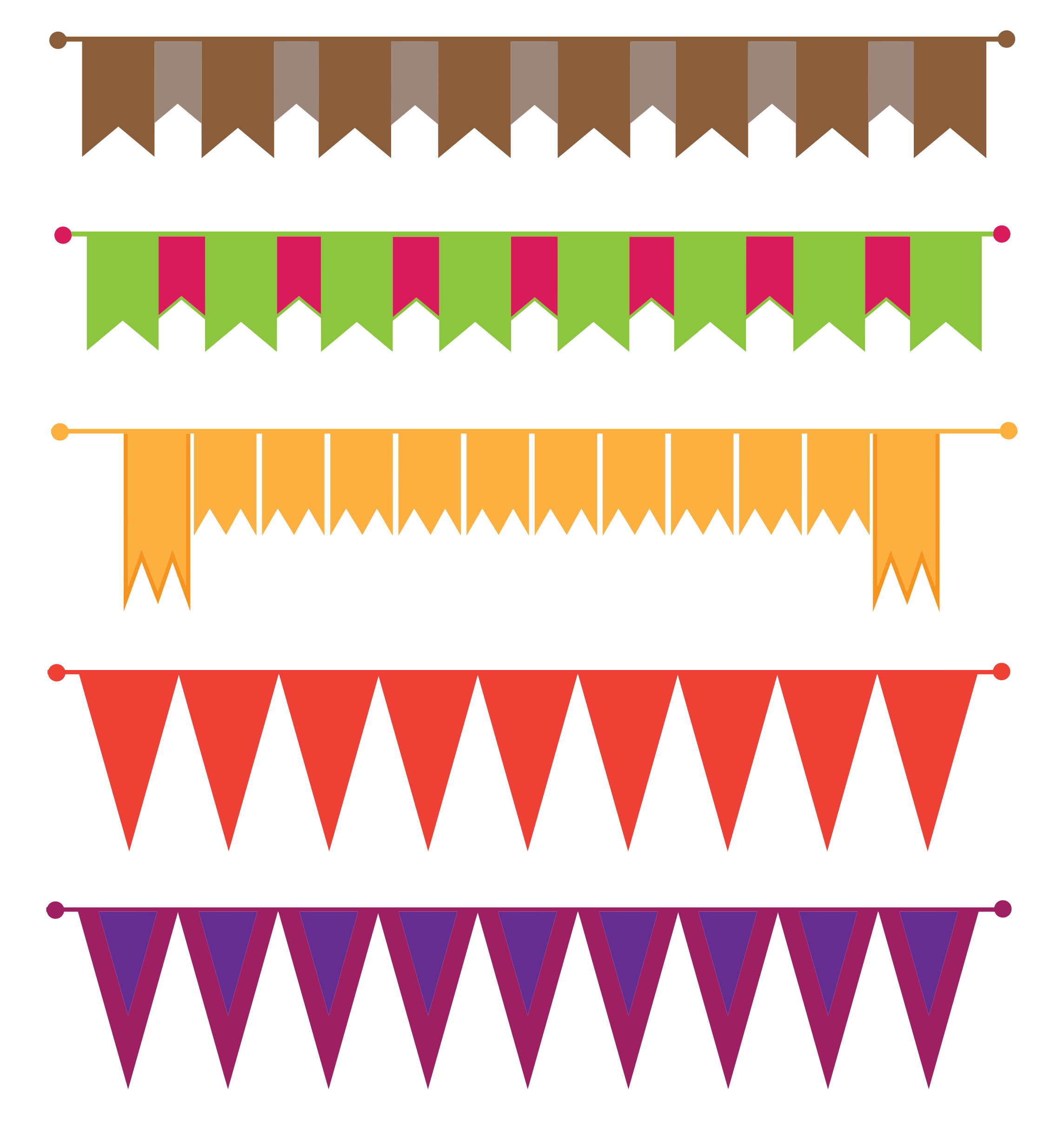 This features a collection of colorful banners, each with different colors and patterns. There are nine distinct banners in total, arranged side by side on the same horizontal plane. Each banner has a unique design, showcasing various shades of purple, orange, yellow, green, pink, brown, and white. The arrangement creates an eye-catching display that can be used for decoration or as part of a larger artistic project.