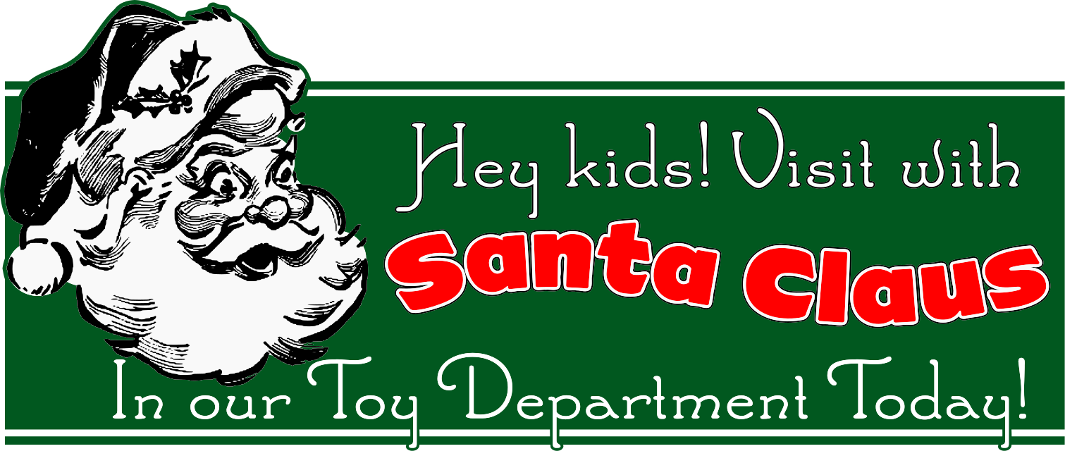 This is a colorful advertisement for Santa Claus in the toy department. It features a large, smiling Santa Claus with his mouth open and a green background. The advertisement reads "Hey kids! Visit Santa in our Toy Department Today!" and has an inviting tone. The image is likely used to attract children and their families to visit the store's toy department during the holiday season, where they can interact with Santa Claus and purchase toys for themselves or as gifts.