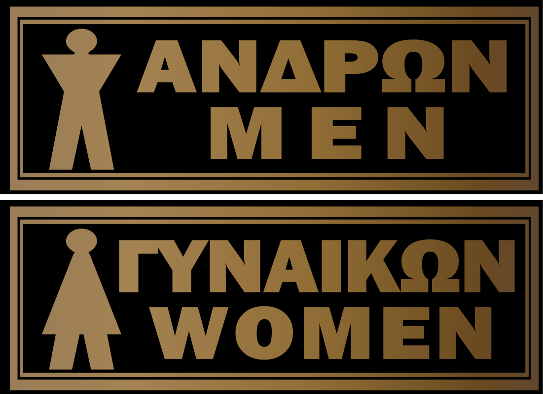 This features two signs, one in Greek and the other in English. The Greek sign reads "Anapon Men" which translates to "Men Only." The English sign is a similar phrase, stating "Tynanakion Women," meaning "Women Only." These signs are likely placed at an entrance or designated area for men and women only.