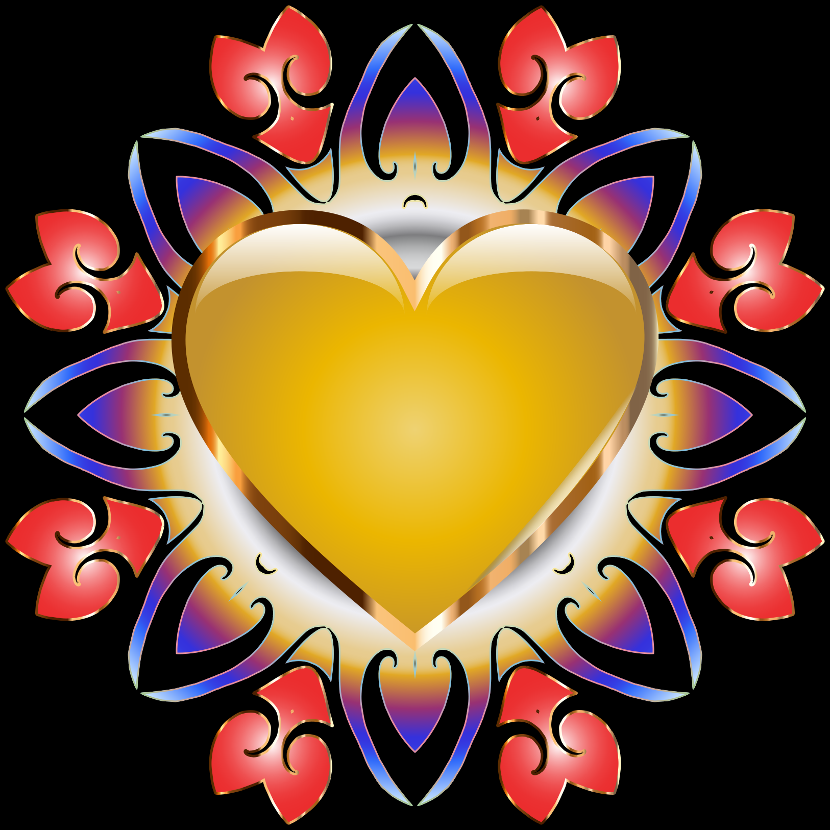 This features a yellow heart with a gold outline, placed in the center of an intricate design. The heart is surrounded by a blue and red pattern that resembles a flower or a sunburst. The overall composition creates a visually appealing and unique artistic piece. The colors used in this design are vibrant and eye-catching, making it stand out as a striking visual element.