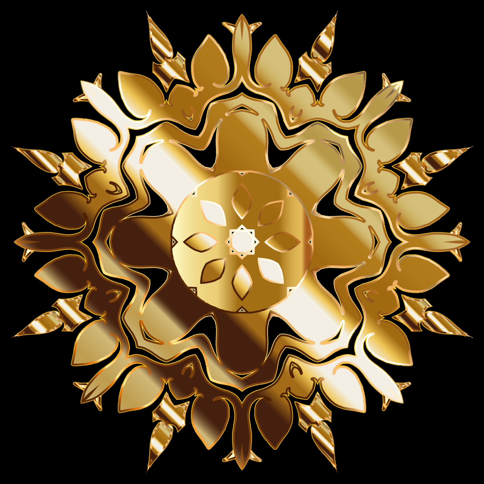 This features a large, ornate golden sunflower with intricate details. The center of the flower is adorned with a yellow circle that has a gold star in it. Surrounding this central element are multiple leaves and petals, all crafted from gold metal. The overall design gives an impression of a decorative piece or artwork, possibly inspired by nature's beauty.