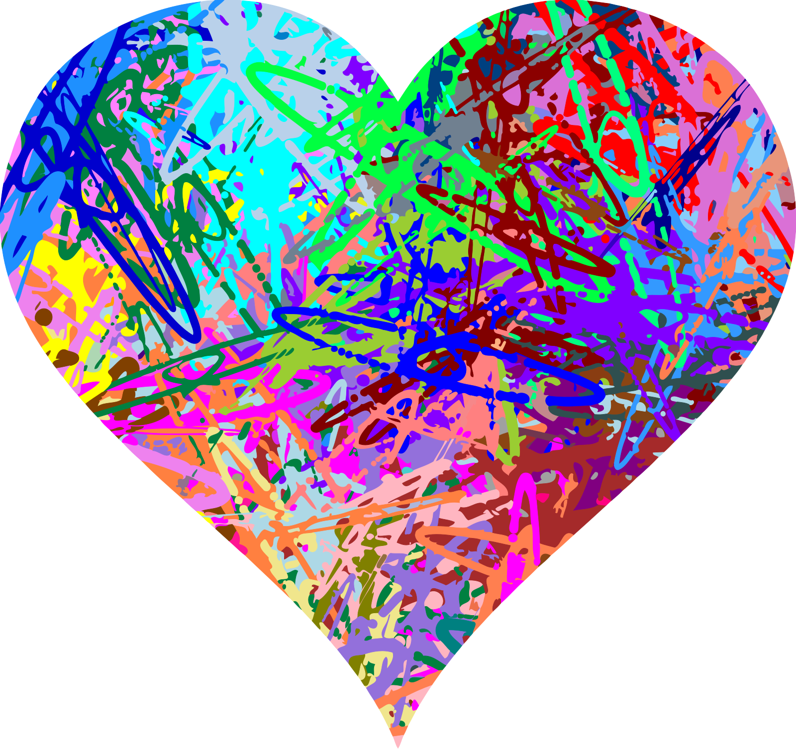 This features a heart-shaped design with various colors and patterns. It is made up of different colored shapes, including blue, green, red, yellow, orange, purple, pink, and black. These shapes are arranged in such a way that they form the shape of a heart. The heart appears to be a collage or a mosaic of these individual shapes, creating an interesting visual effect. The colors and patterns used in this design make it visually appealing and unique.