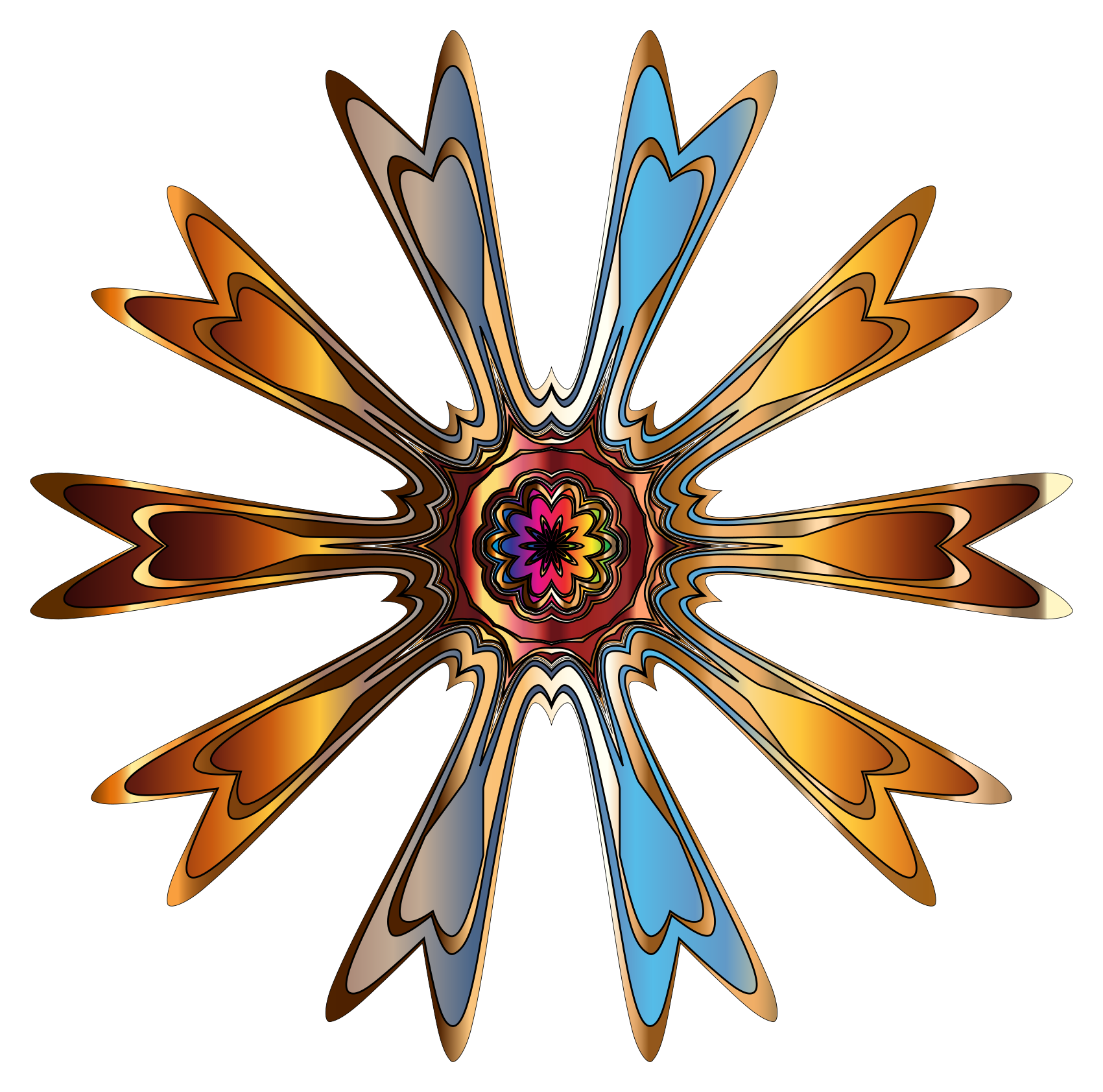 This features a vibrant and colorful flower-like design with an orange, yellow, blue, and purple hue. It is composed of multiple petals that are arranged in a circular pattern, creating a visually striking centerpiece. The intricate details on the petals add depth to the overall composition, making it an eye-catching piece of artwork. This unique design could be used as a decorative element or even as a wall hanging to brighten up any space.