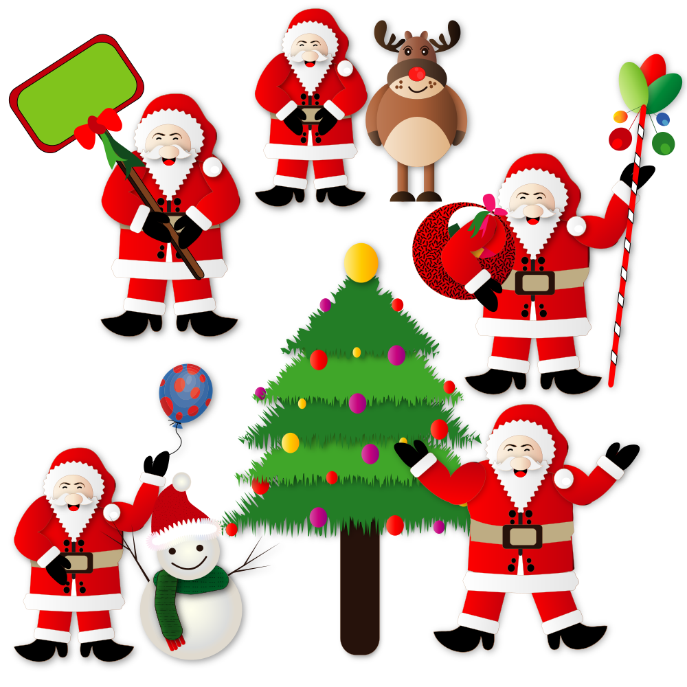 This features a collection of six different Santa Claus figures, each with unique poses and expressions. One Santa is holding a green sign, another is standing next to a reindeer, another is holding a bag of gifts, another is posing with a snowman, and the last one has his hands up in excitement. In the center of the scene, there is a beautifully decorated Christmas tree adorned with red and yellow ornaments. The Santa figures are arranged around the tree, creating an eye-catching and festive display.